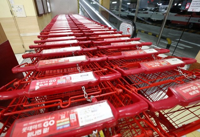 Xe đẩy hàng xếp hàng dài bên ngoài siêu thị lớn ở Seoul vào ngày đóng cửa. Ảnh: Yonhap. |