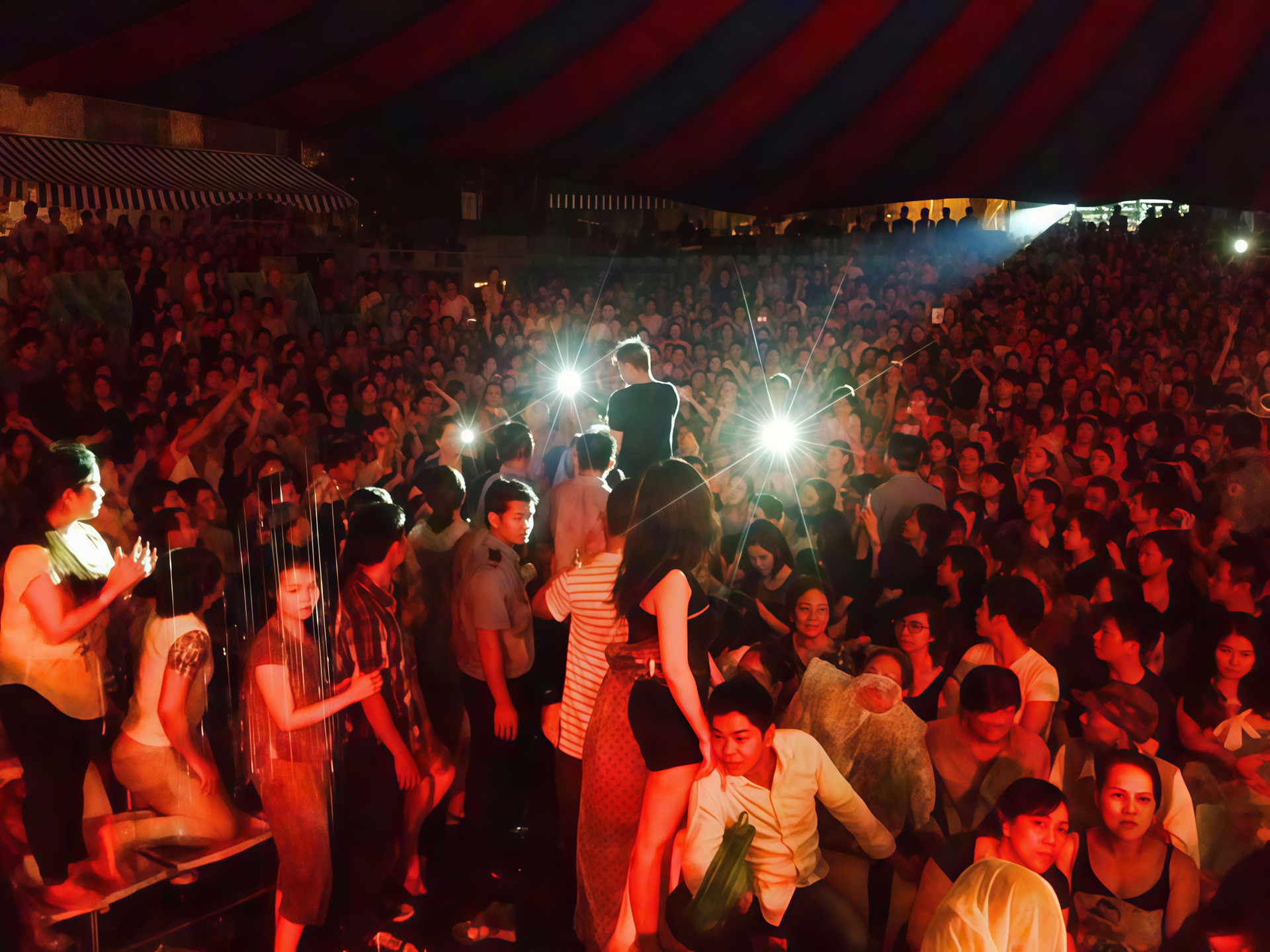 "Nếu ra sân khấu, bạn phải tốn tiền vé, xếp hàng, tới sớm giành chỗ đẹp, chưa kể chen lấn còn có nguy cơ bị móc túi. Khán giả có tiền không chuộng các sân khấu ngoài trời kiểu này vì vấn đề thời tiết. Khán giả bình dân - đối tượng khách hàng chính - cũng dần chọn ở nhà xem truyền hình, YouTube miễn phí lại có thể vừa xem vừa ăn uống cùng gia đình", ông bầu phân tích.