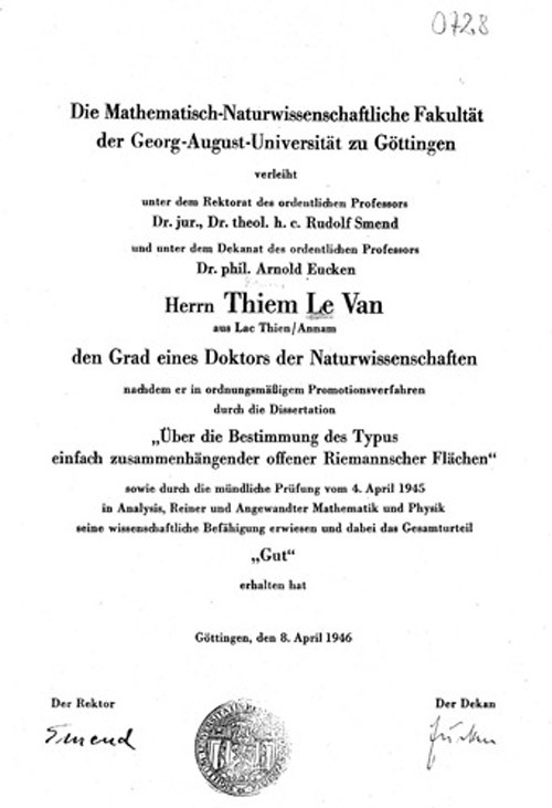 Luận án Tiến sĩ Toán học của ông về giải tích phức được bảo vệ thành công năm 1945 tại Đại học Göttingen. Tên của luận án tạm dịch là: "Về việc xác định kiểu của một diện Riemann mở đơn liên". Buổi bảo vệ được tổ chức vào ngày 4/4/1945, sau đó bằng tiến sĩ được trao vào ngày 8/4/1946 với điểm đánh giá trung bình: Giỏi. Ông được xem là người Việt Nam đầu tiên có bằng Tiến sĩ Toán học.