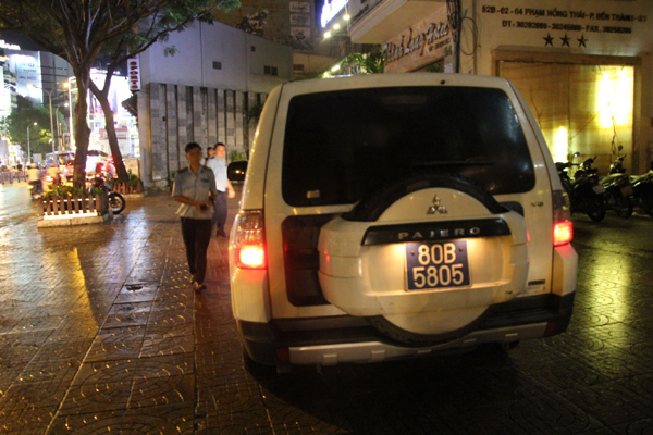 Hai ô tô biển xanh 80B đậu trên vỉa hè bị ông Đoàn Ngọc Hải cho xử phạt. Trong đó một xe vắng tài xế bị niêm phong cẩu về trụ sở.