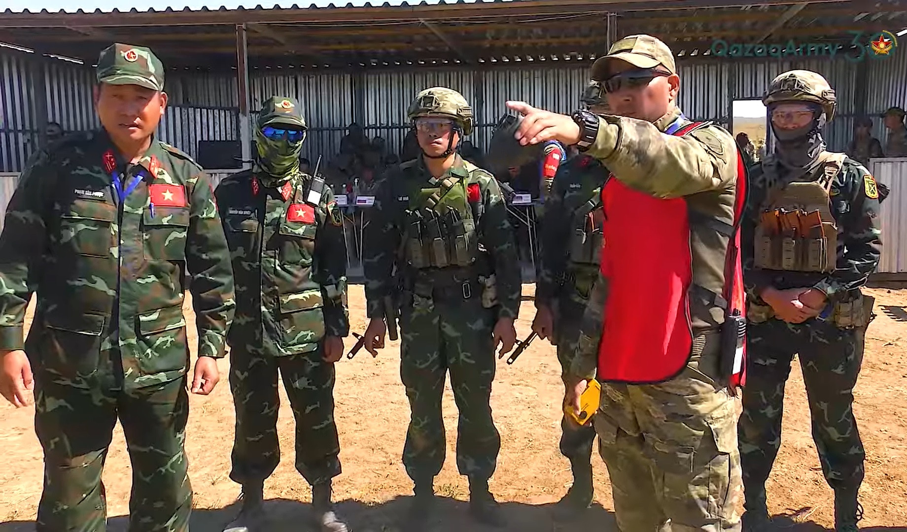 Đoạn video được Bộ Quốc phòng Kazakhstan đăng tải hôm nay (17/8) cho thấy, các tuyển thủ đội Việt Nam tham dự môn “Xạ thủ chiến thuật” phải thực hiện những bài bắn với súng trường tiến công AK-74M có lắp kính ngắm trong điều kiện phải mang theo thương binh giả định đi cùng.