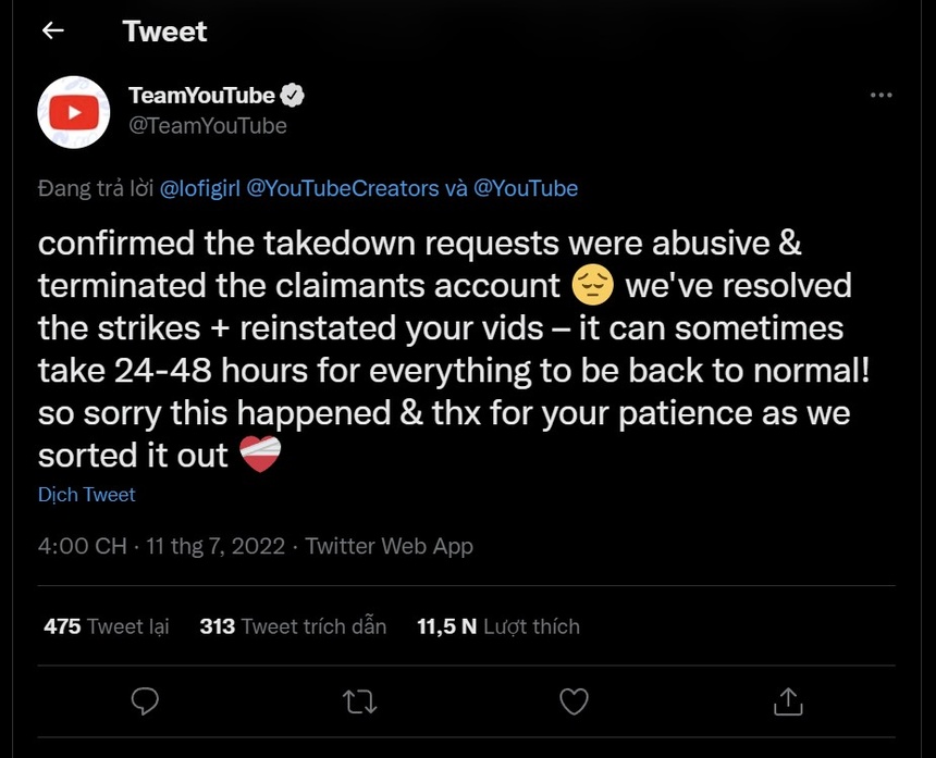 Bên dưới bài đăng của Lofi Girl, tài khoản chính thức của YouTube phản hồi rằng nền tảng đã giải quyết yêu cầu bản quyền và đang khôi phục lại video. “Có thể mất 24-48 giờ để mọi thứ trở lại bình thường. Rất xin lỗi vì sự cố đáng tiếc này”, @TeamYouTube trả lời.