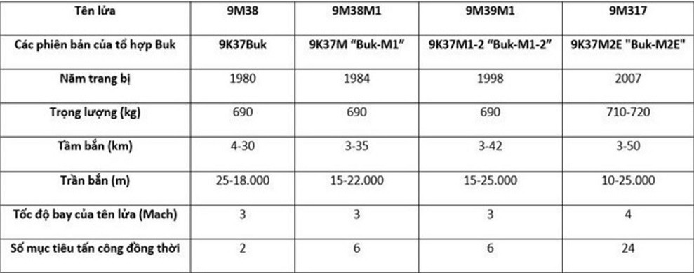 Tên lửa được hệ thống Buk đời đầu sử dụng có tên 9M38, trọng lượng 690kg; tầm bắn từ 4-30km; trần bắn từ 25-18.000m. Ở những phiên bản sau, tầm bắn và trần bắn của tên lửa cũng được nâng cao hơn.