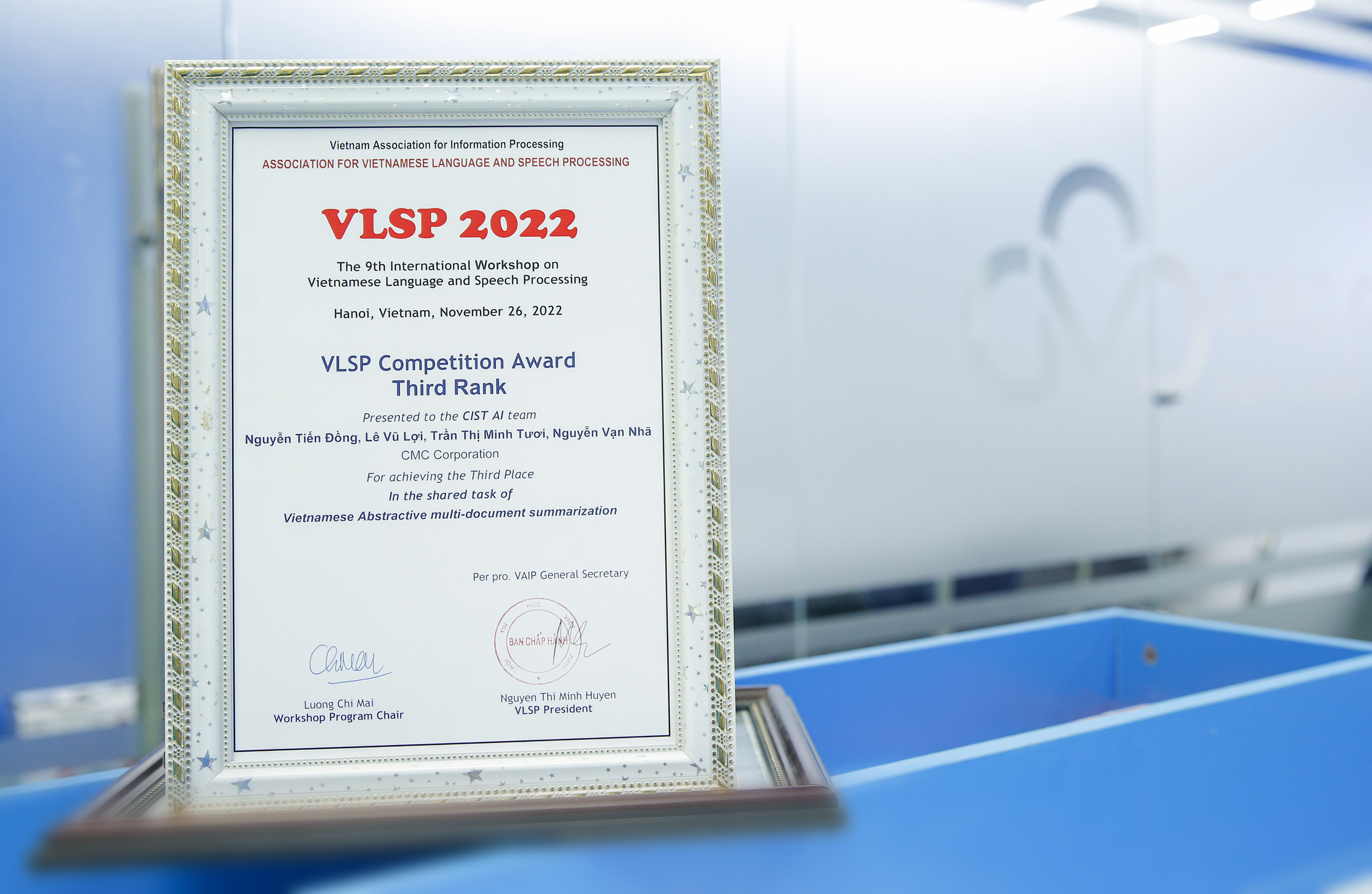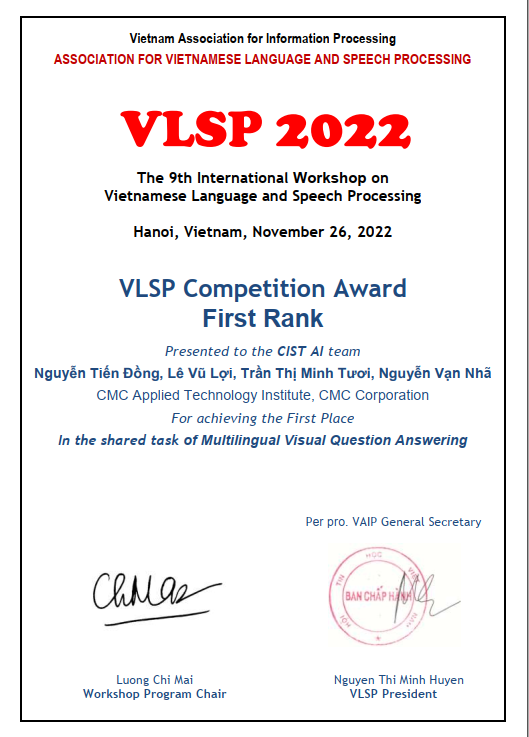 Nhóm CMC AI của Viện Nghiên cứu Ứng dụng Công nghệ CMC (CMC ATI) tiếp tục nhận cú đúp giải thưởng tại cuộc thi Xử lý Ngôn ngữ và Tiếng nói tiếng Việt - VLSP 2022 (Vietnamese Language and Speech Processing) với một giải Nhất và một giải Ba.