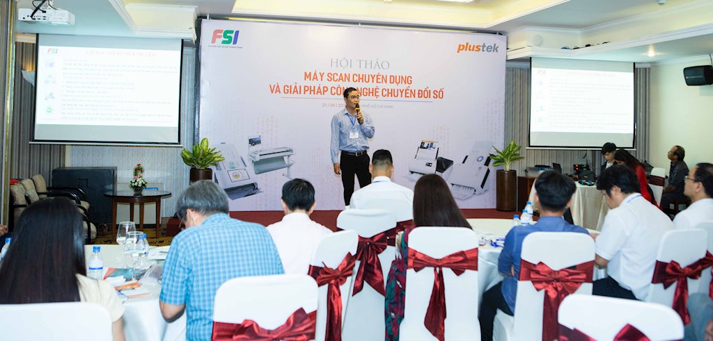 Để hỗ trợ cho quá trình chuyển đổi số của doanh nghiệp, tại hội thảo, FSI đã giới thiệu nhiều dòng máy scan Plustek trong đó có những dòng máy mới ra mắt tháng 6/2019 được trang bị nhiều công nghệ hiện đại như hệ thống ánh sáng được thiết kế theo tiêu chuẩn, khay nạp tài liệu tự động ADF, hỗ trợ khổ giấy tối đa A4 cùng công nghệ CCD và 2 nguồn sáng đèn LED nên có thể quét cùng lúc 2 mặt tài liệu trong một lượt giấy chạy qua…