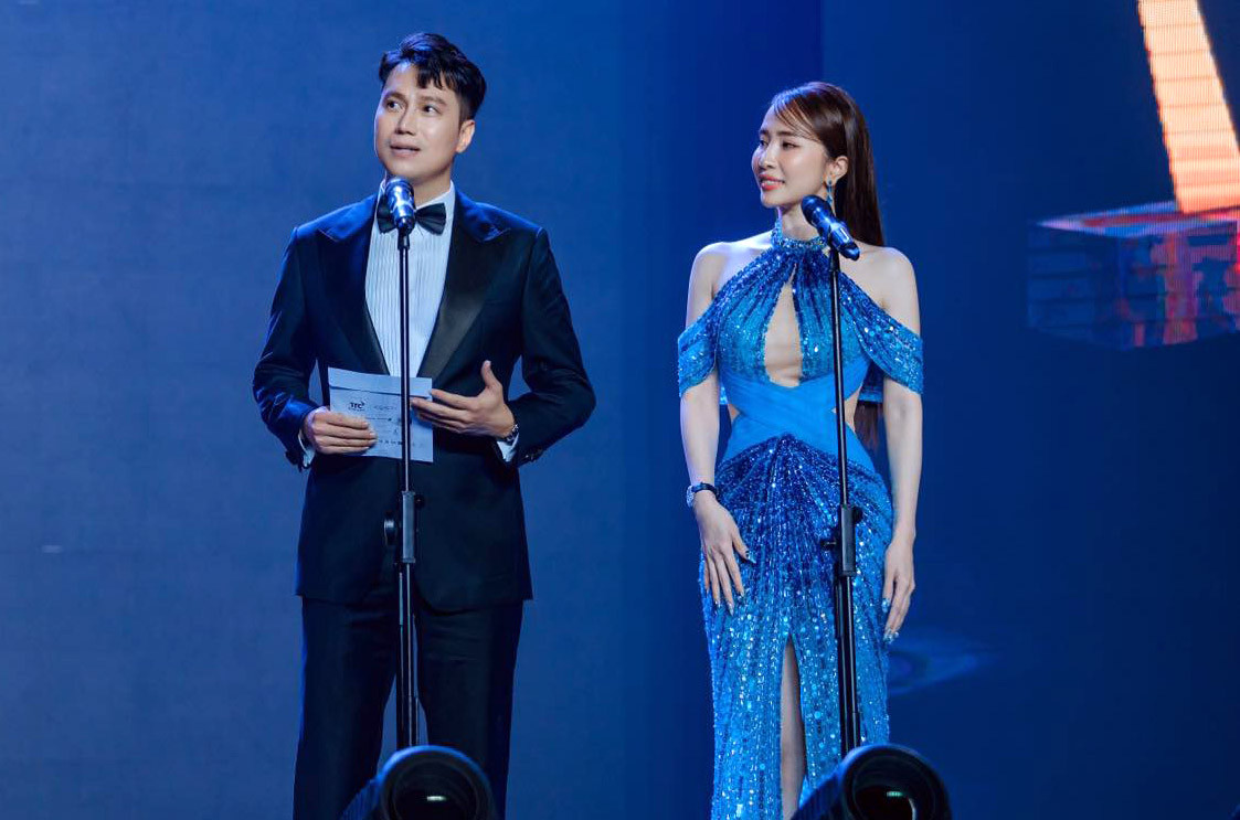 Xuất hiện trên sân khấu lễ trao giải Cánh diều 2021 tối 13/9 tại Nha Trang, Việt Anh luôn hướng ánh mắt về phía Quỳnh Nga.