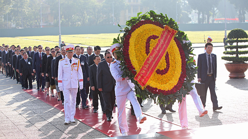 Sáng nay, Tổng bí thư, Chủ tịch nước Lào Bounnhang Vorachith đã đặt vòng hoa và vào Lăng viếng Chủ tịch Hồ Chí Minh.