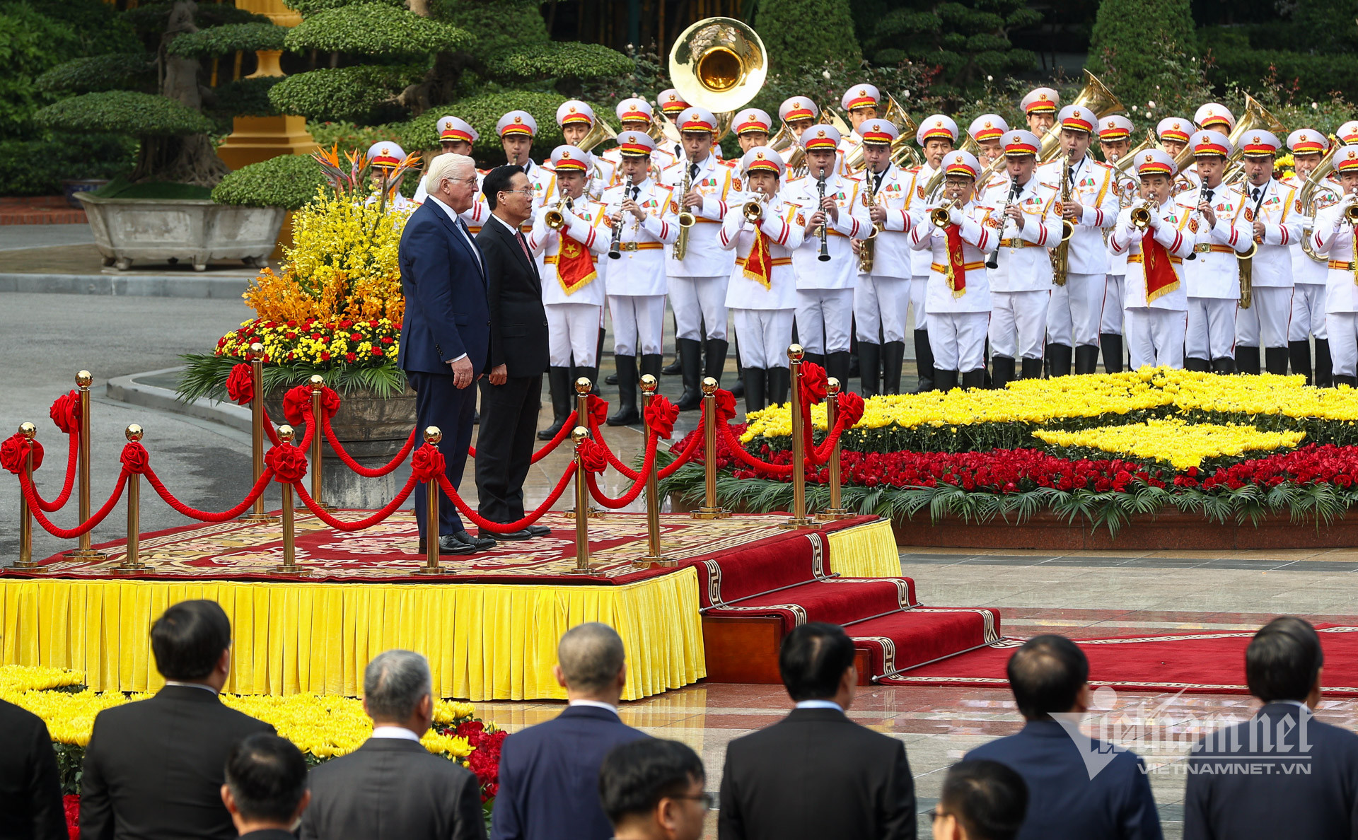 Chủ tịch nước Võ Văn Thưởng chào đón Tổng thống Frank-Walter Steinmeier. Ảnh: TTXVNChủ tịch nước Võ Văn Thưởng và Tổng thống Đức duyệt đội danh dự Quân đội Nhân dân Việt Nam.Nghi thức bắn 21 phát đại bác. Ảnh: TTXVNNghi thức bắn đại bác được truyền trực tiếp từ Hoàng thành Thăng Long về Phủ Chủ tịch.