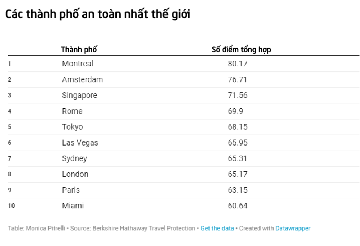 Berkshire Hathaway Travel Protection cũng phát hành một bộ xếp hạng riêng cho các quốc gia và thành phố an toàn nhất, kết hợp kết quả khảo sát với số liệu thống kê tội phạm và các yếu tố liên quan tới Covid-19.