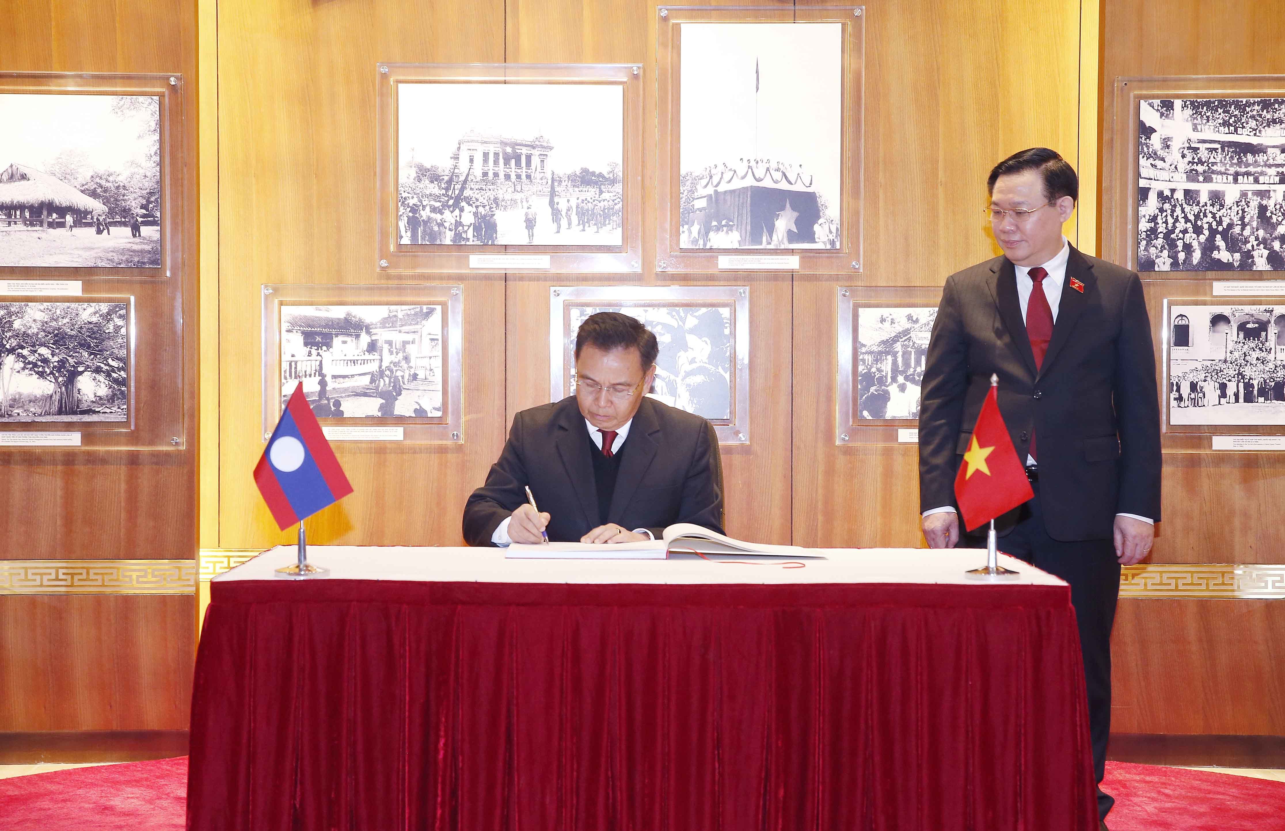 | Sau lễ đón, Chủ tịch Quốc hội hai nước đã thăm quan Phòng Truyền thống của Quốc hội Việt Nam và Chủ tịch Quốc hội Xaysomphone Phomvihane ghi lưu bút vào Sổ lưu niệm. |