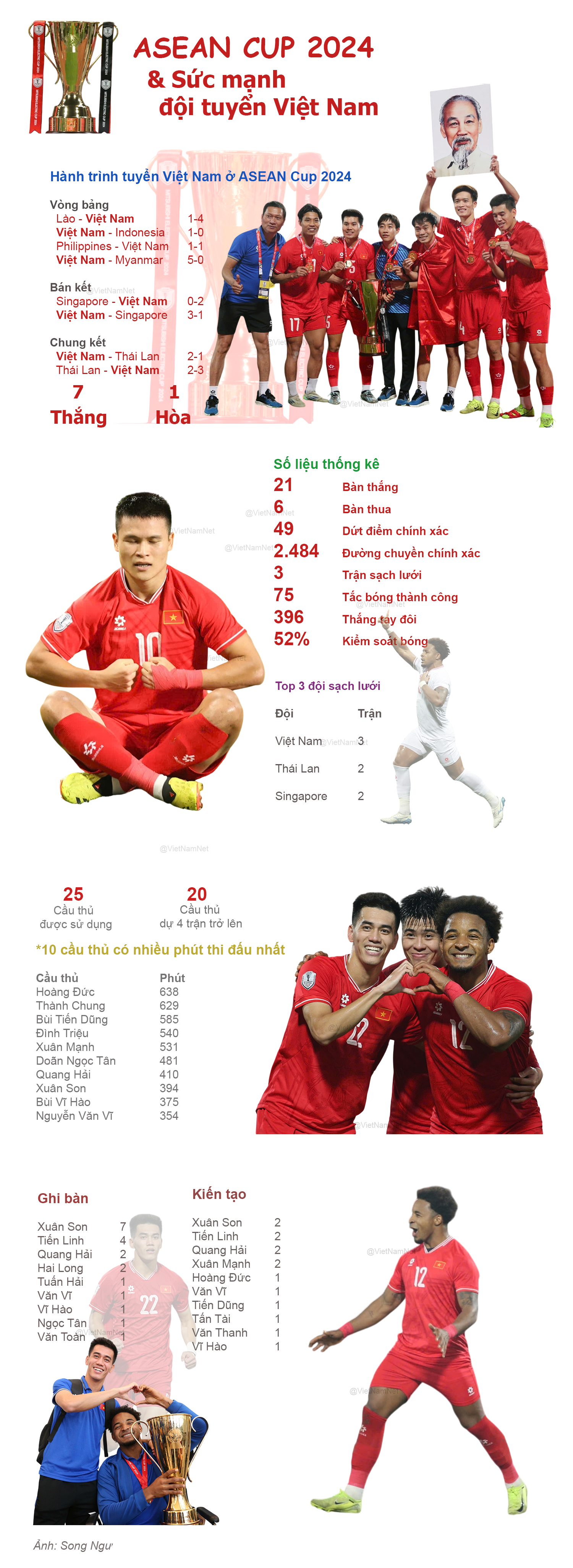 Với HLV Kim Sang Sik, tuyển Việt Nam có 9 cầu thủ ghi bàn trên hành trình đăng quang (cùng 1 pha phản lưới của đối thủ), 10 người có ít nhất 1 pha kiến tạo.