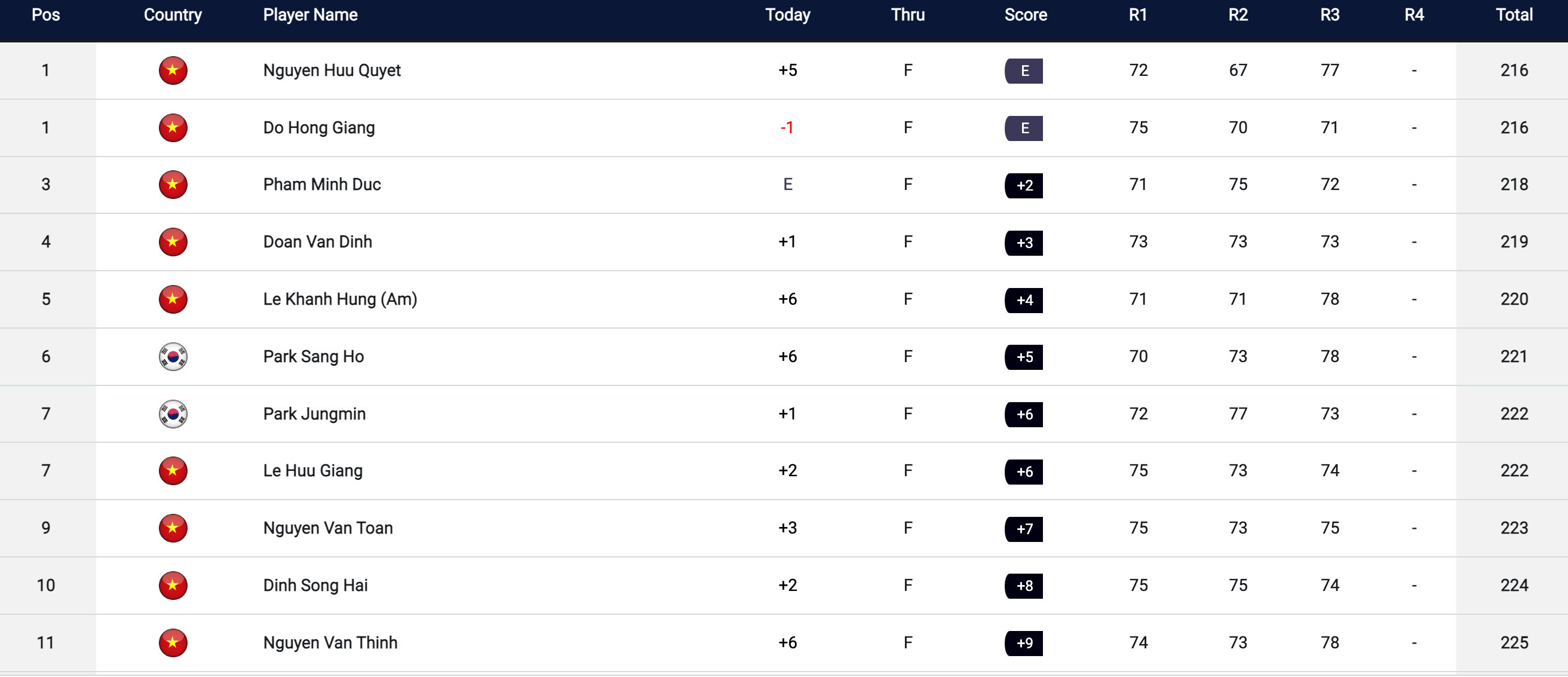Giải đấu năm nay chứng kiến phong độ không tốt của các golfer người nước ngoài. Park Sang Ho là VĐV có thành tích tốt nhất trên BXH với điểm +5 sau 3 ngày thi đấu, tạm đứng ở vị trí thứ 6. Golfer người Hàn Quốc chính là nhà Á quân của Vietnam Master 2019, sau ba hố phụ nghẹt thở với golfer số 1 Việt Nam Trần Lê Duy Nhất.