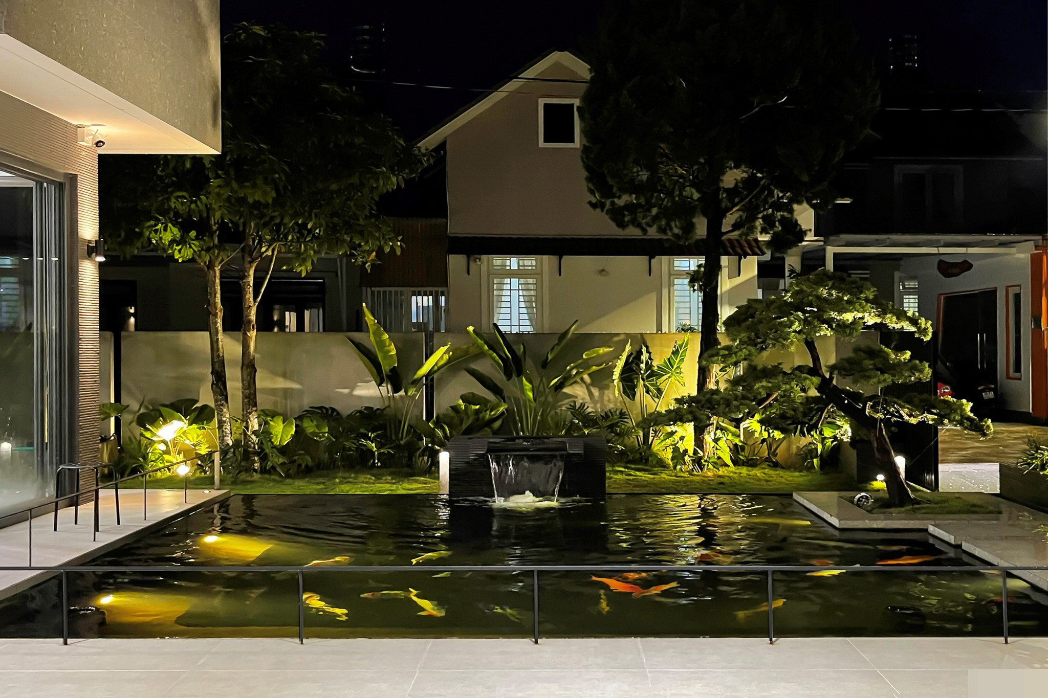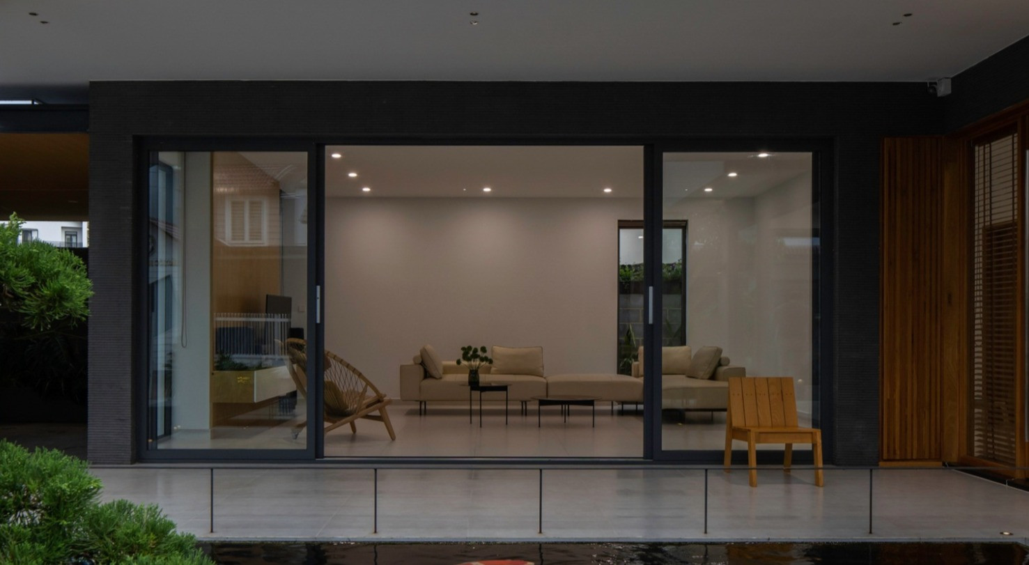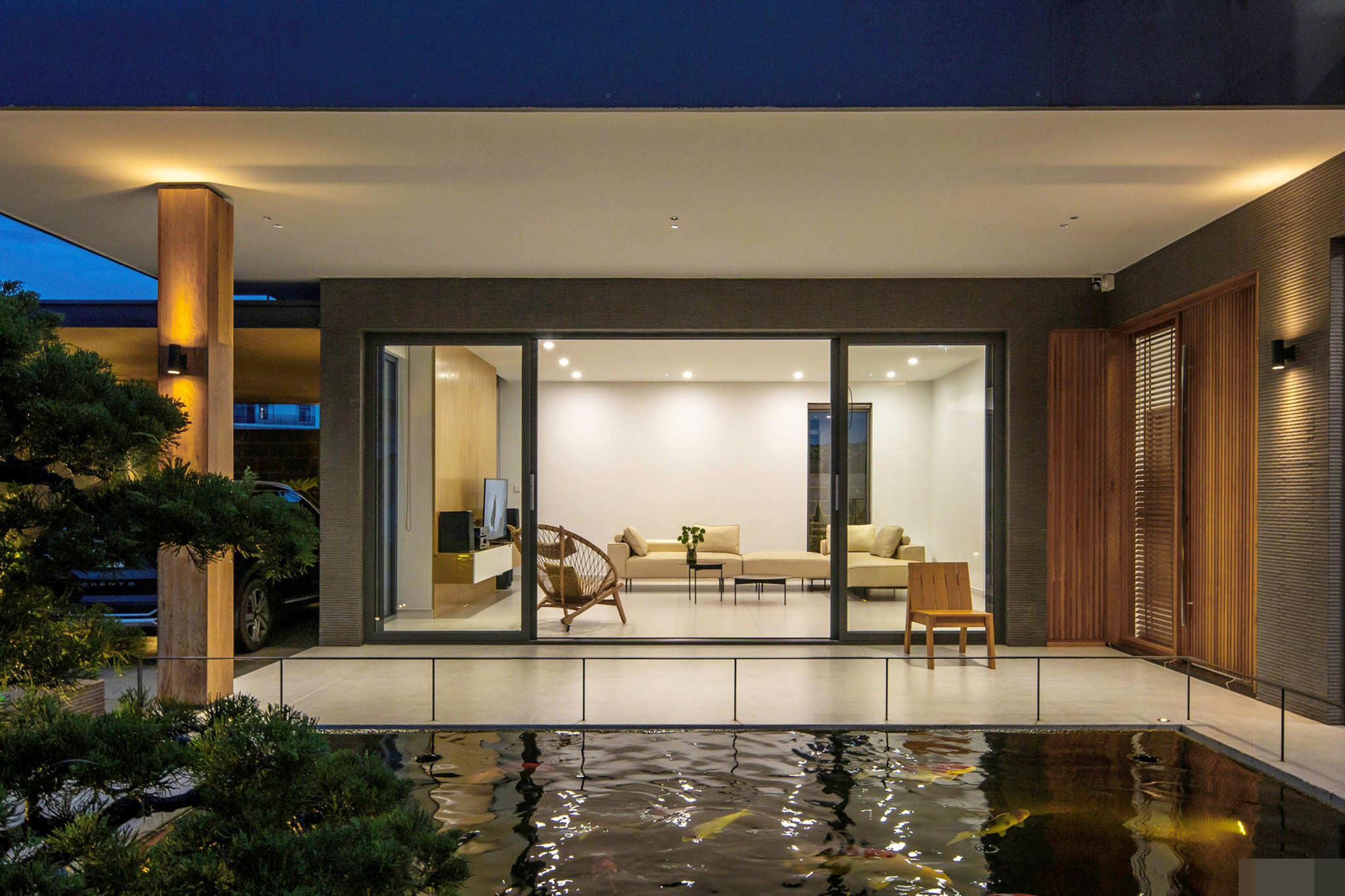 Mái sảnh hay mái hiên vốn là không gian đa năng của người Việt, là nơi đón ta về, là nơi mở cửa, là nơi thay giầy, là nơi ngồi đón cơn gió mát mẻ đầu mùa, là nơi trẻ con chơi đùa, là nơi người lớn trải chiếu khi có cỗ hay là nơi pha ấm trà mở đầu câu chuyện hàn huyên… Xung quanh hồ Koi có bố trí hệ lan can thép mảnh để giới hạn không gian. Vừa đủ chiều cao an toàn cho trẻ em mà không ảnh hưởng đến góc ngắm cá từ trong nhà nhìn ra.Tâm điểm phòng khách của căn nhà là khung cửa tỷ lệ 21:9, bằng tỷ lệ rạp chếu phim với mong muốn các thành viên ngắm nhìn khung cảnh được chuyển tiếp sớm hôm, bốn mùa Xuân- Hạ- Thu- Đông như một bộ phim cuộc đời, dậy sớm đun ấm trà cùng với ông nội thưởng thức buổi sáng bình yên, chiều về thủ thỉ với con những chuyện đi học ở trường, buổi tối vợ chồng dùng một chút vang nhẹ chia sẻ đôi ba câu chuyện tâm tình, giản đơn mà hạnh phúc.