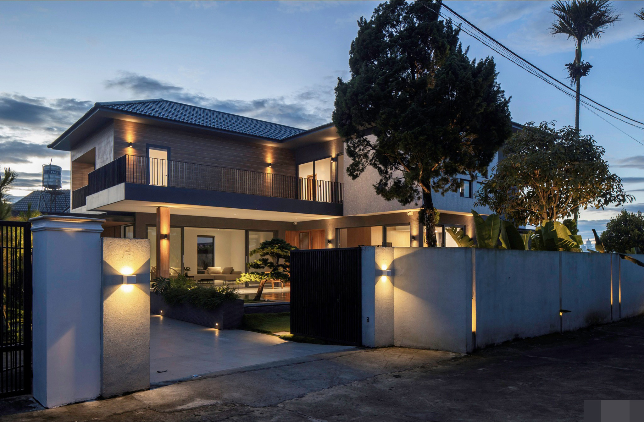 Ngôi nhà mang phong cách resort, sử dụng không gian mở với khung cửa kính ở phòng khách nhìn ra vườn có kích thước rộng, giống màn hình của rạp chiếu phim.