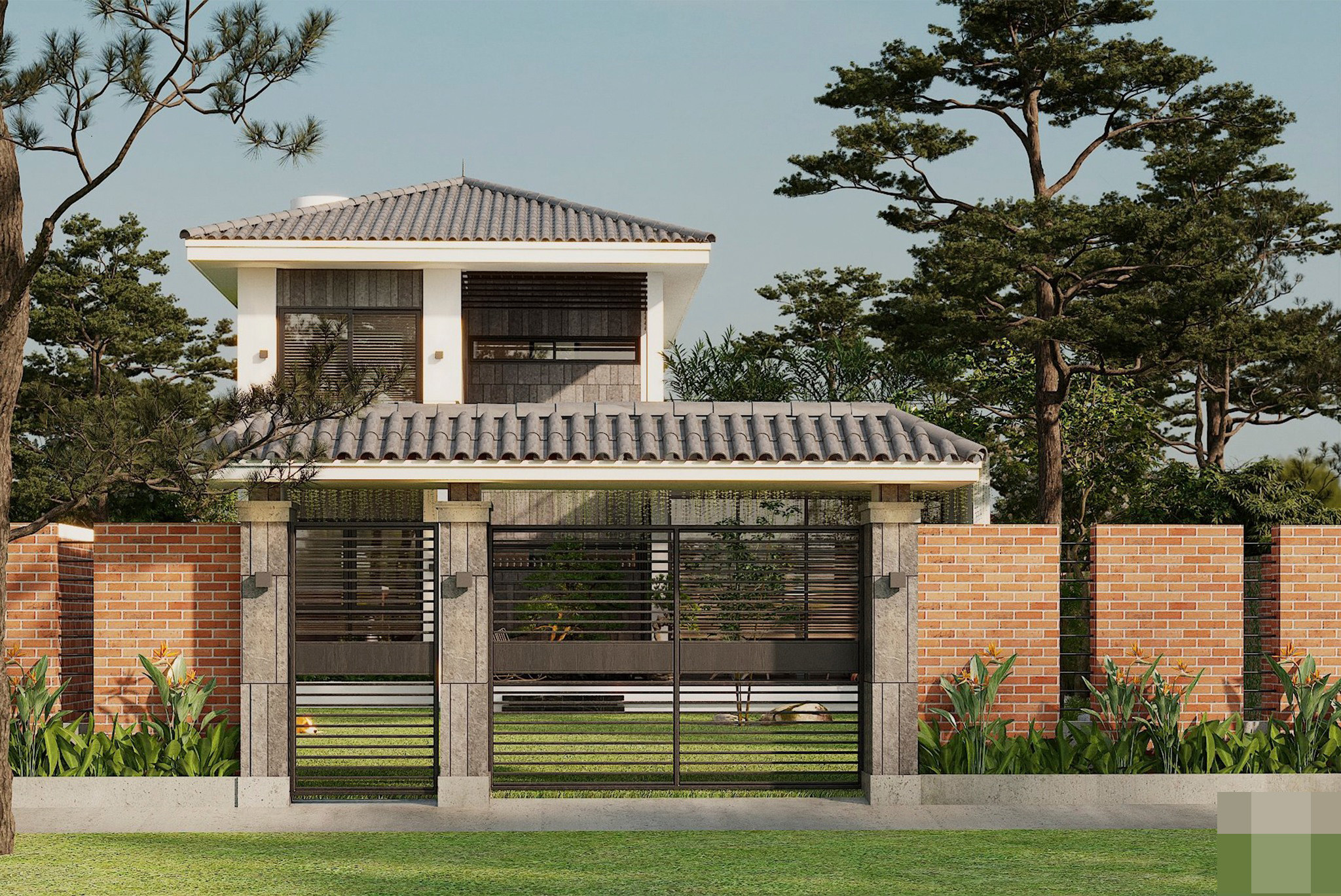Hàng rào ngói đỏ xây mộc mang đến sự gần gũi, chiếc cổng giản đơn kết hợp phần mái Nhật thể hiện sự tôn trọng phong cách chủ đạo nhưng cũng có biến tấu hiện đại, ấn tượng hơn. Trước nhà là thảm cỏ xanh rì, êm ái để con trai có thể đá bóng với bố, con gái chạy nhảy cùng mẹ.