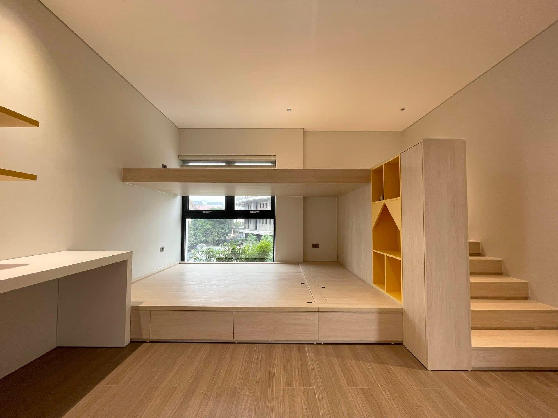Phòng ngủ bố trí nhiều hộc tủ, kệ nhằm tăng tối đa diện tích sử dụng, lưu trữ giúp nhà luôn gọn gàng.