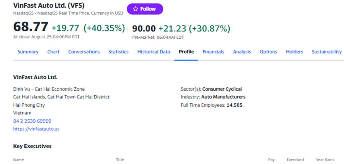 Trước giờ mở cửa phiên giao dịch ngày 28/8 trên sàn chứng khoán Nasdaq của Mỹ, cổ phiếu VinFast (VFS) của tỷ phú Phạm Nhật Vượng vẫn chưa dừng bứt phá với việc tăng thêm hơn 30% so với phiên liền trước từ 68,77 USD/cp lên mức giá cao kỷ lục mới 90 USD/cp, tương ứng giá trị công ty đạt gần 210 tỷ USD.