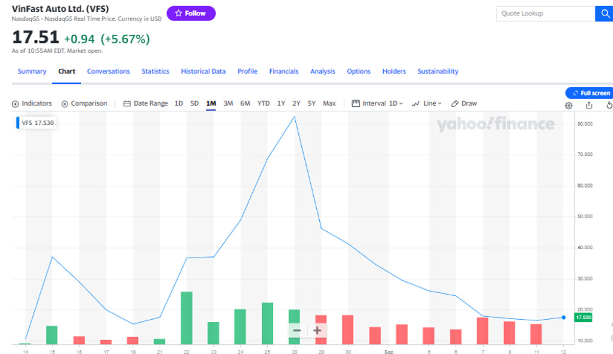 Tính tới 21h55 ngày 12/9 (giờ Việt Nam), cổ phiếu VFS tăng gần 5,7% so với phiên liền trước, lên 17,51 USD/cp. Dù vậy, mức giá này còn thấp so với mức giá chào sàn hơn 37 USD/cp hôm 15/8.