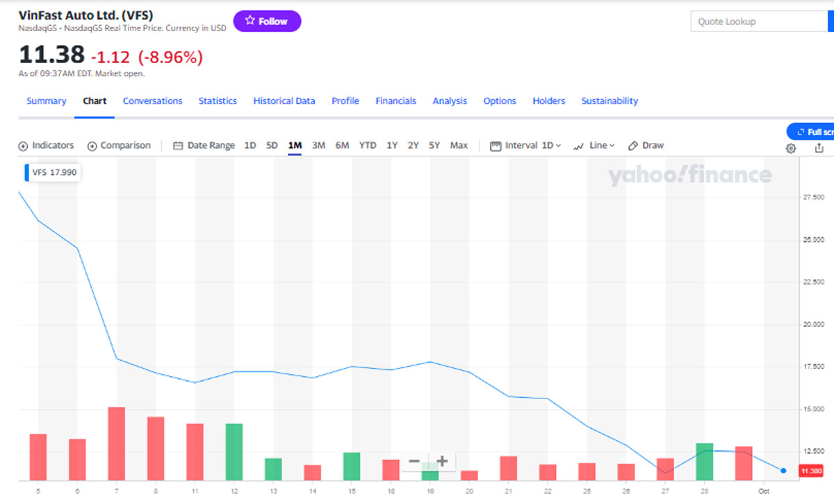 Cụ thể, tính tới 20h40 ngày 2/10 (giờ Việt Nam), cổ phiếu VFS giảm hơn 8% so với phiên liền trước xuống dưới 11,5 USD/cp.