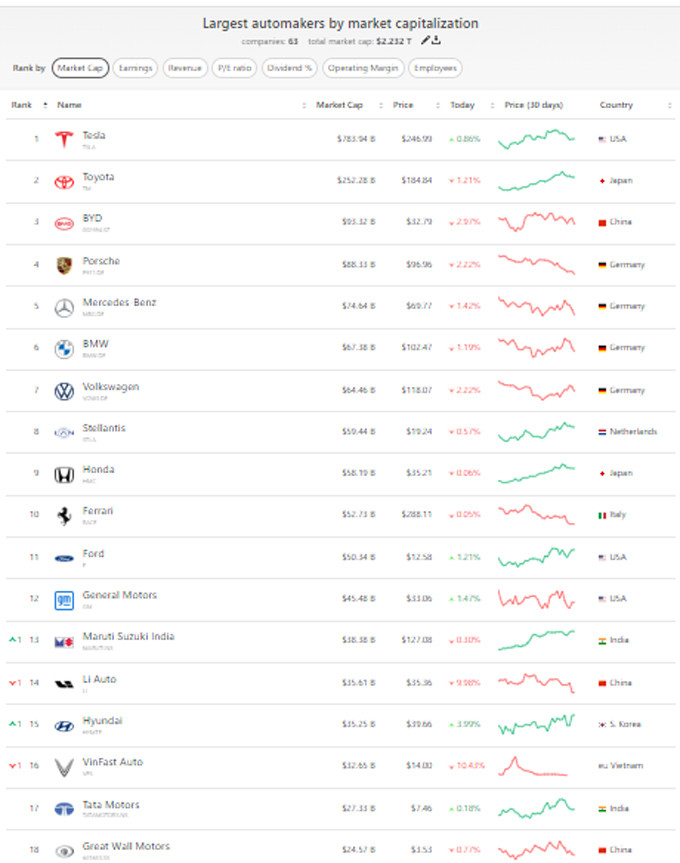 Với việc cổ phiếu giảm 5 phiên qua, vốn hóa của VinFast xuống thứ 16 trên thế giới, xếp sau hãng xe Hyundai của Hàn Quốc, Li Auto của Trung Quốc và sau hãng Maruti Suzuki India.