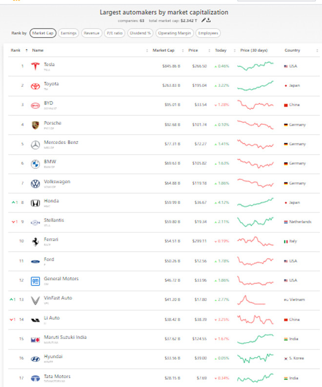 Với mức vốn hóa ổn định như gần đây, VinFast xếp trên hãng xe Li Auto của Trung Quốc và xếp thứ 13 trong làng xe hơi thế giới.