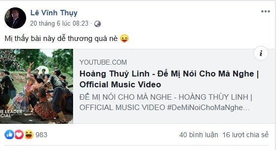 | Không những vậy, cách đây một tháng, Vĩnh Thuỵ chia sẻ MV Để Mị nói cho mà nghe của Hoàng Thuỳ Linh chỉ sau ít giờ công bố. Nam siêu mẫu tự xưng “Mị” và dành lời khen cho “tình cũ” trong MV. |