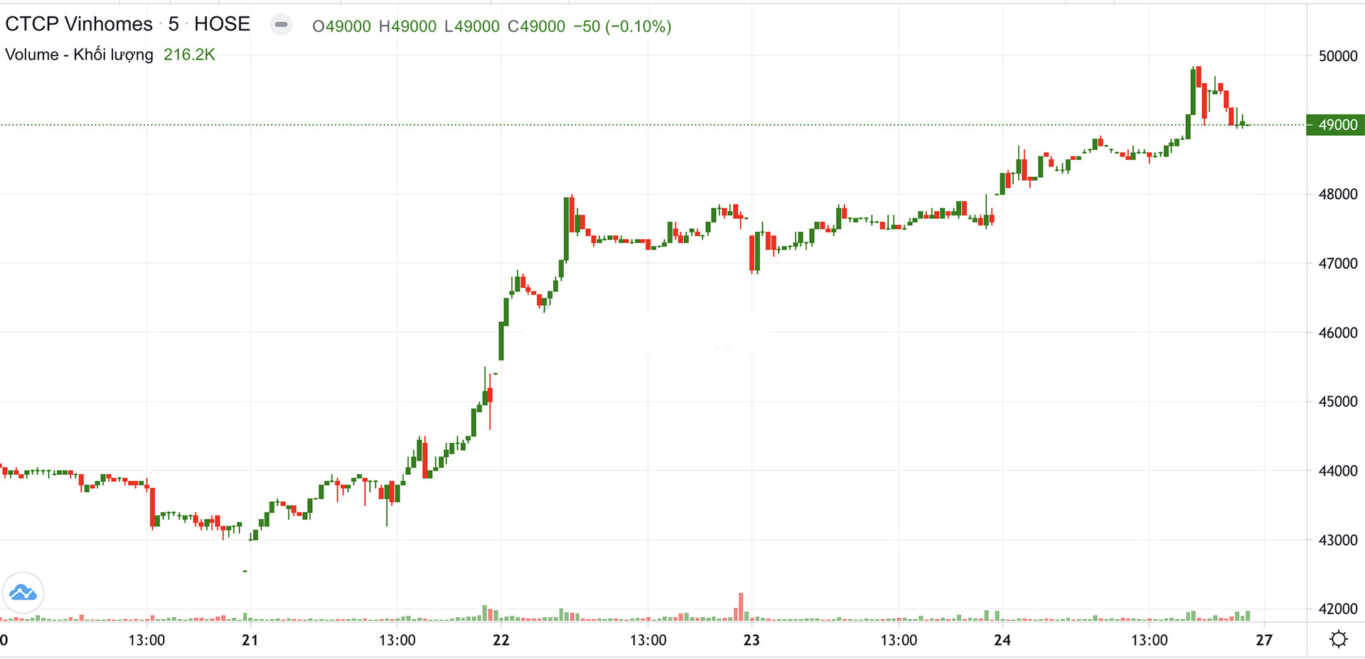 Cụ thể, giá cổ phiếu của VHM tăng từ 42.550 đồng phiên 20/3 đã tăng lên 49.000 đồng khi khép lại phiên 24/3. Nhờ đó, giá trị vốn hoá tăng 28.000 tỷ đồng, tức gần 1,2 tỷ USD.