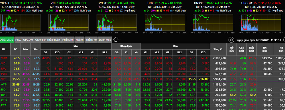 Trước đó, kết thúc phiên sáng 27/10, chỉ số VN-Index tăng 8,08 điểm lên 1.001,44 điểm. HNX-Index tăng 2,04 điểm lên 207,99 điểm.