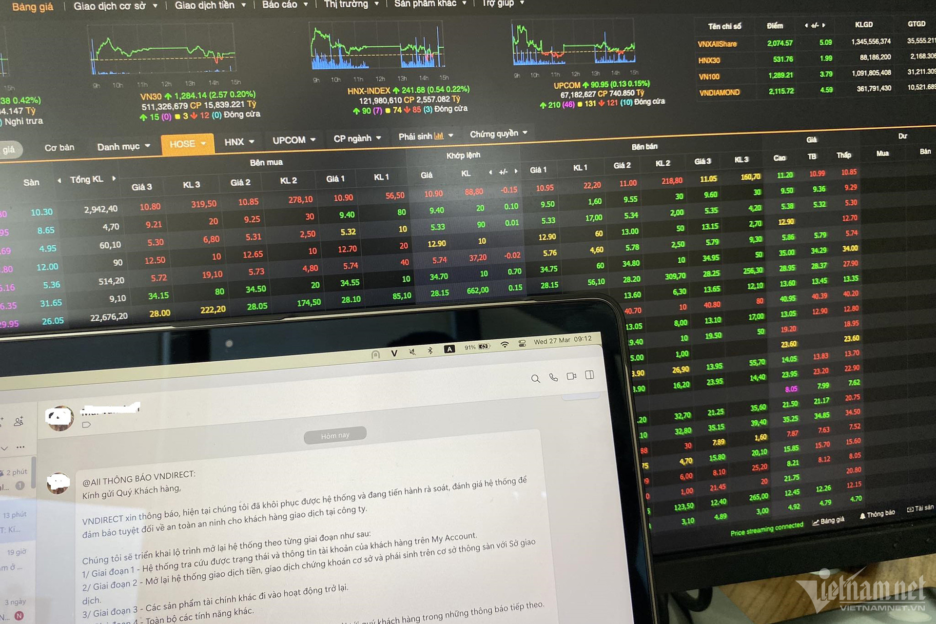 Thông báo mới trên website của đơn vị mình, VNDIRECT cũng thông tin về lộ trình mở lại hệ thống theo 4 giai đoạn, gồm: Giai đoạn 1 - Hệ thống tra cứu được trạng thái và thông tin tài khoản của khách hàng trên My Account; Giai đoạn 2 - Mở lại hệ thống giao dịch tiền, giao dịch chứng khoán cơ sở và phái sinh trên cơ sở thông sàn với Sở giao dịch; Giai đoạn 3 - Các sản phẩm tài chính khác đi vào hoạt động trở lại; Giao đoạn 4 - Toàn bộ các tính năng khác.