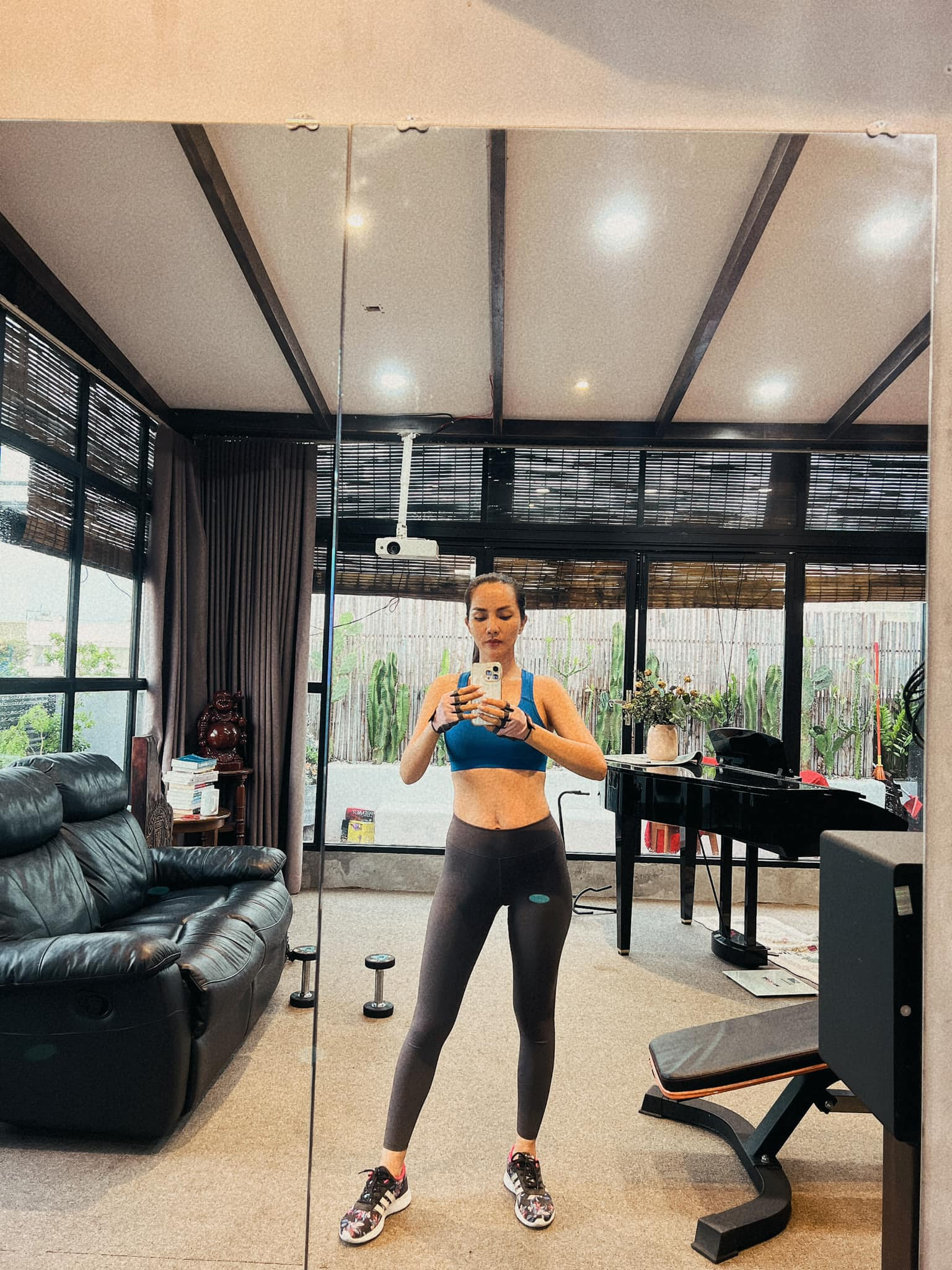 Để giữ dáng, bà xã ca sĩ Hoàng Bách thường xuyên tập thể dục thể thao tại nhà.