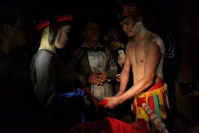 Đúng 0h, khoảnh khắc giao thời giữa đêm 11 sang ngày 12 tháng Giêng, chủ từ sẽ mở khóa mang hòm thiêng bên trong chứa sinh thực khí của nam (Nõ) và sinh thực khí của nữ (Nường). Sau đó, cụ chủ từ trao cho cặp vợ chồng anh Chiến, chị Huyền.