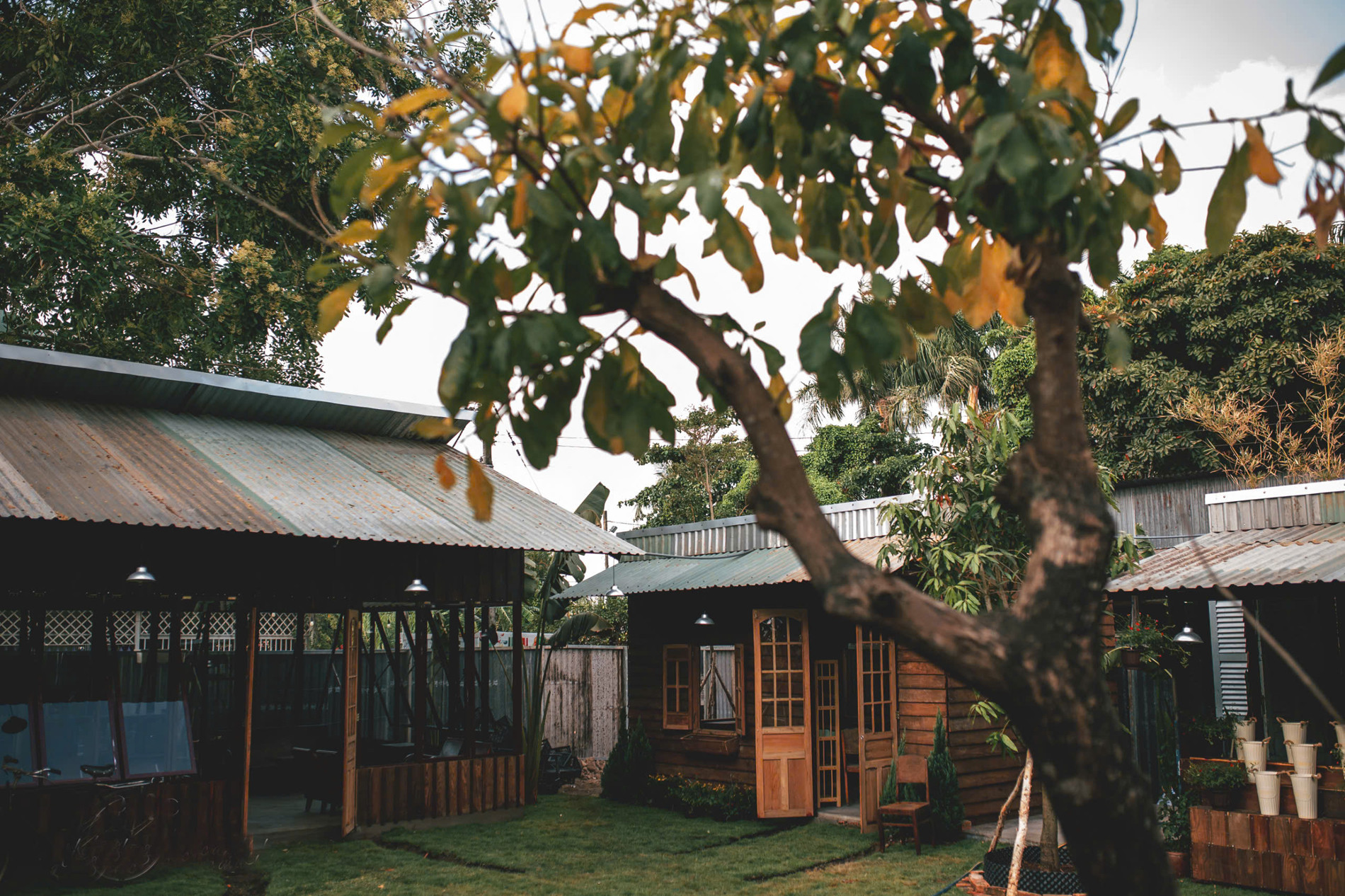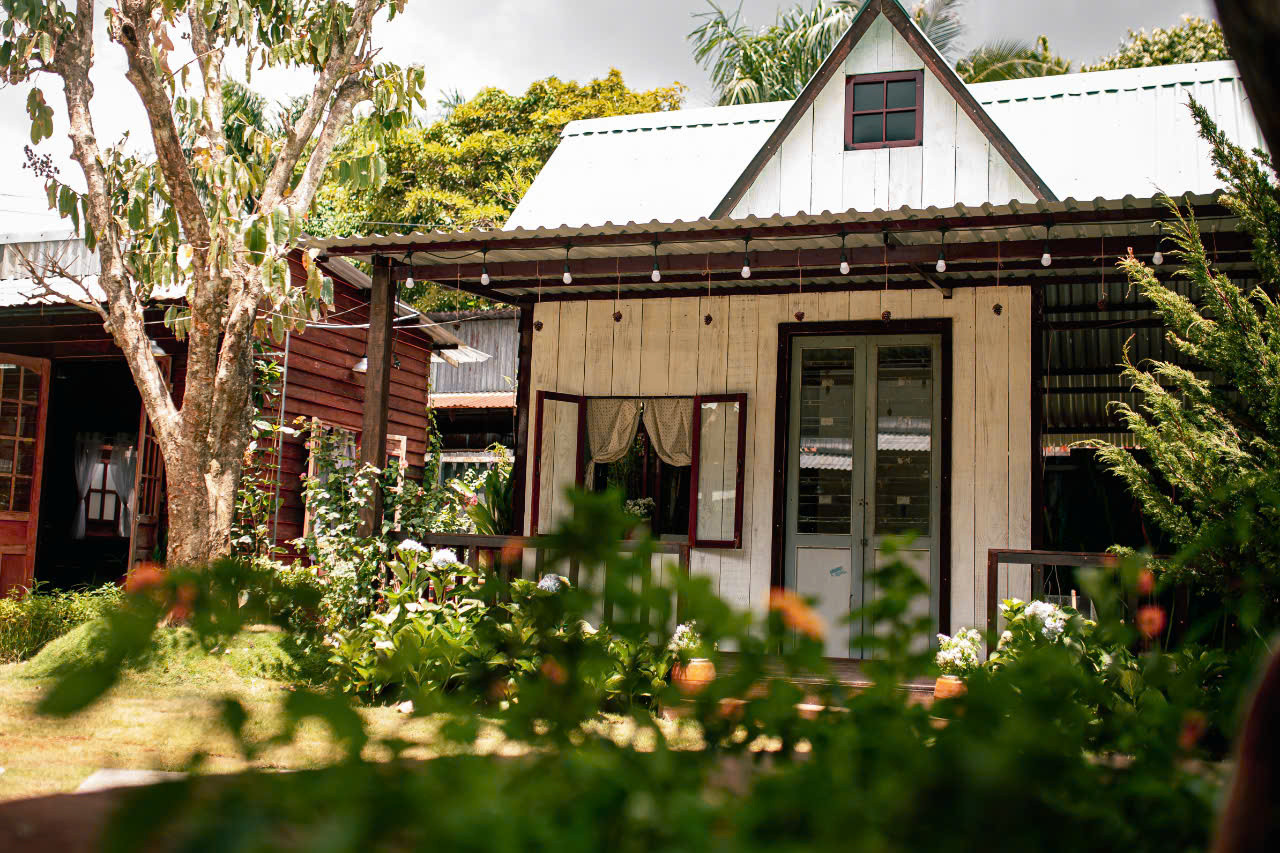 Gian còn lại nổi bật với tông màu trắng, phần mái thiết kế cách điệu, được sơn màu xanh. Tất cả kết hợp lại, tạo nên một không gian yên bình, hoài niệm, có thể “chữa lành” tâm hồn.