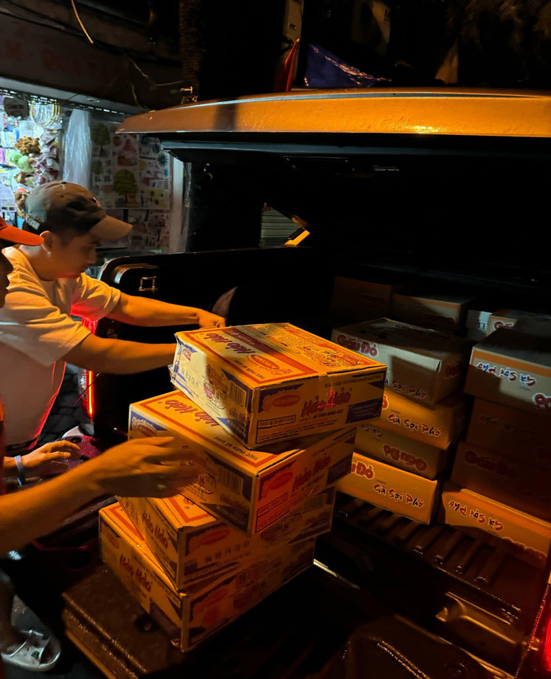 Chuyến xe của chị chở 120 chiếc đèn pin, 29 thùng mỳ tôm, 5 thùng sữa cùng nhiều vật dụng khác, mong muốn phần nào giúp người dân vượt qua những ngày bão lũ gian nguy.
