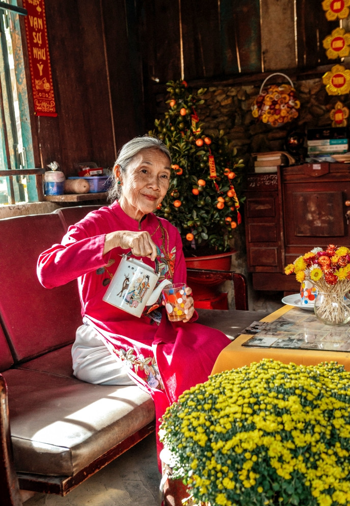 Nghệ sĩ Thanh Hiền - người lớn tuổi nhất đoàn phim đẹp lão với áo dài.