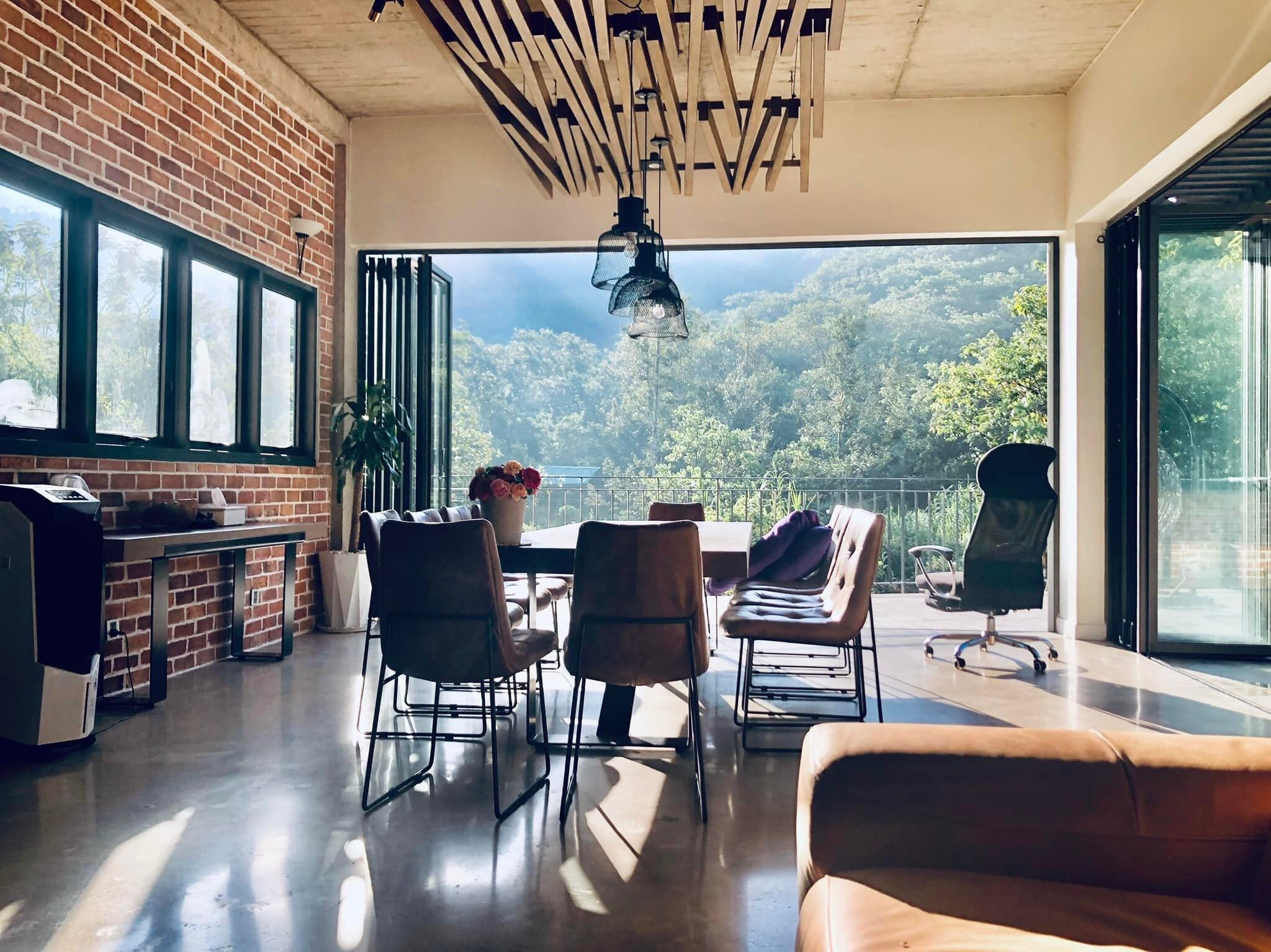 Các phòng chức năng chủ yếu được thiết kế mở với hệ cửa kính lớn. Khi cần, gia chủ mở cửa kính rộng sang sát hai bên, tạo cảm giác không gian sống như "chạm" trực tiếp vào thiên nhiên xung quanh.