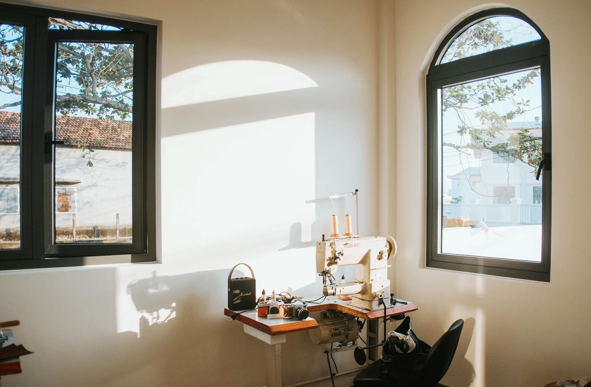 Ô cửa sổ tròn ngay góc bàn làm việc. Chị hay cắm hoa và xông trầm ở đây. Chị thích nhiều cửa sổ bằng kính để nhà lúc nào cũng đầy nắng. Riêng chi phí cho hệ thống cửa trong nhà khi hoàn thiện hết khoảng 70 triệu đồng.