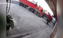 Bé trai bị xe đầu kéo đâm ngã và cuốn vào gầm. Nhưng rất may, cậu bé đã nhanh chóng bò ra khỏi gầm xe, thoát chết trong gang tấc.