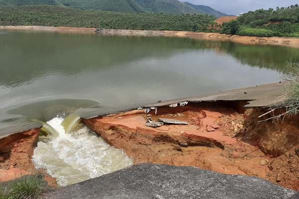 | Đoạn vỡ đập có chiều dài khoảng 5m. Ảnh: TTXVN |