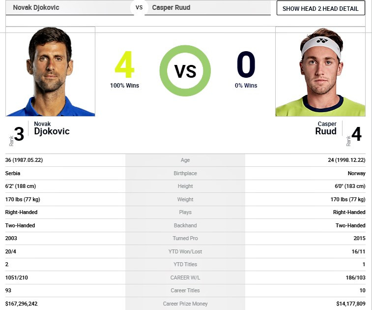 Casper Ruud đã để thua trắng không thắng nổi set nào trước Nole ở những trận thể thức 3 set, lần gặp đầu tiên ở Grand Slam này anh đã có chuẩn bị điều gì khác biệt hay chưa? Tất cả sẽ có câu trả lời vào đêm nay.