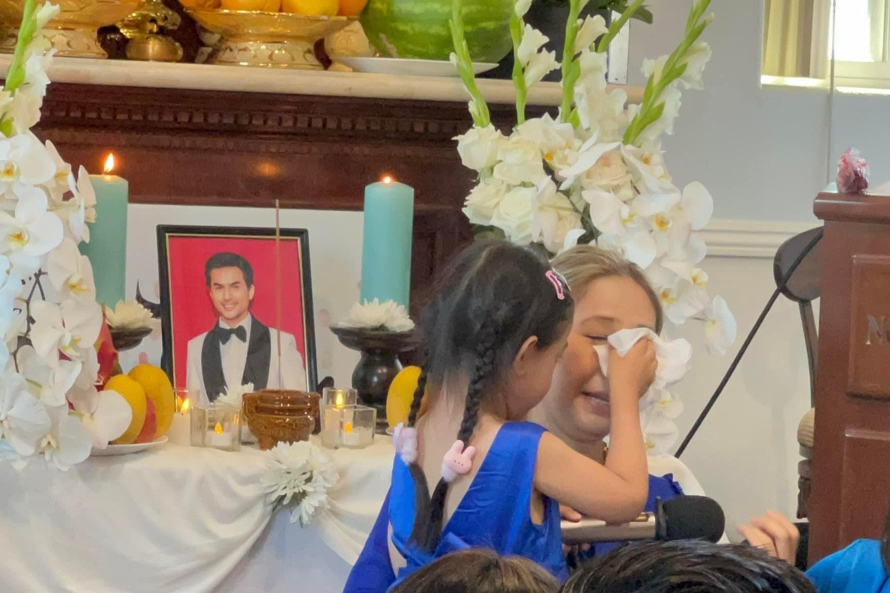 Bình Phương và con trong tang lễ diễn viên Đức Tiến: