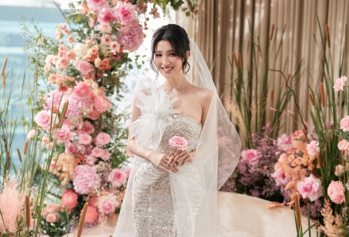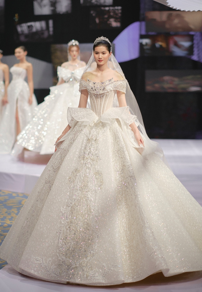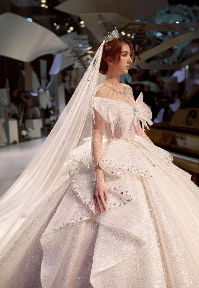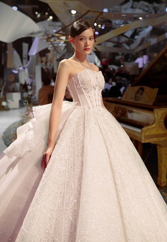 Một chiếc váy cưới bồng xòe luôn là lựa chọn của các cô gái. Nhà thiết kế chọn kiểu đính kết tia đến từ đá rhinestone cùng điểm nhấn là đá moonstone tạo nét hiện đại.