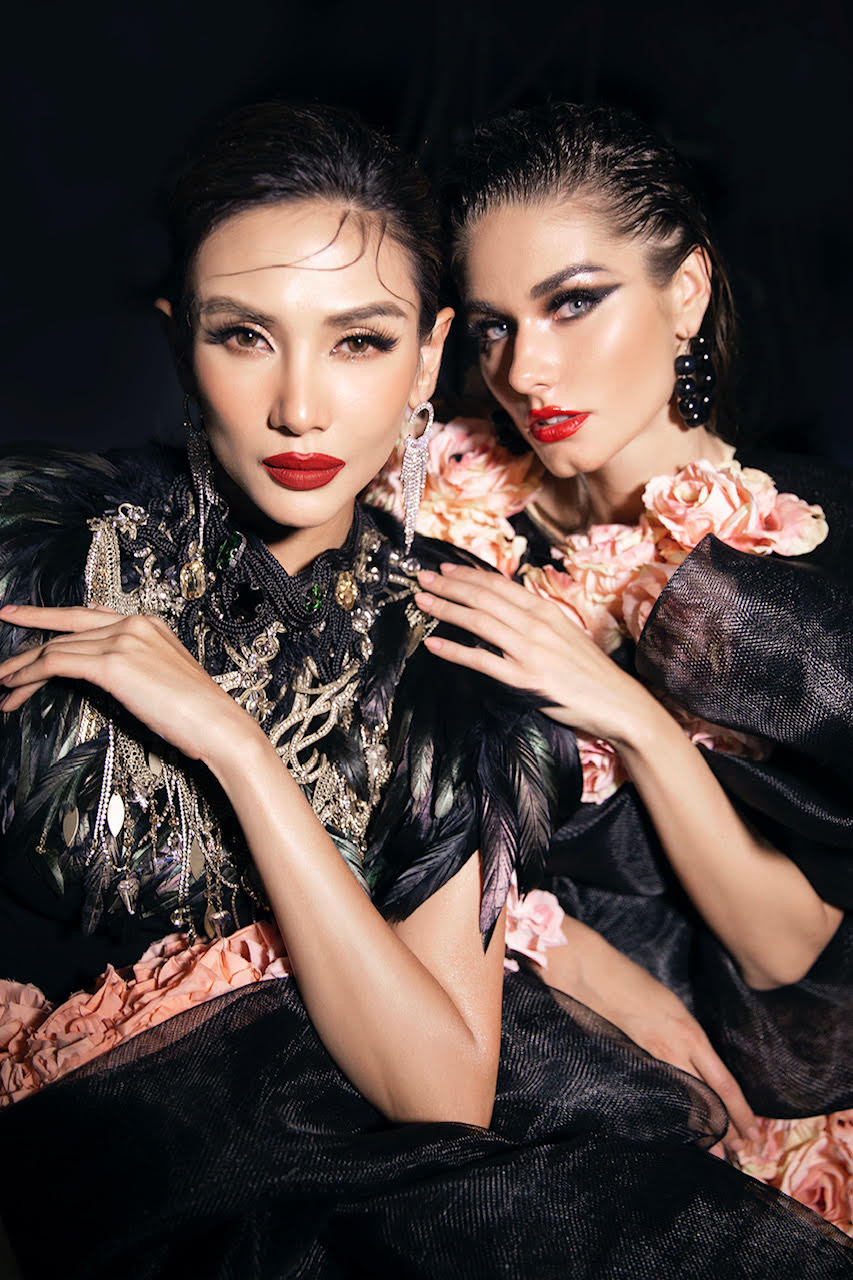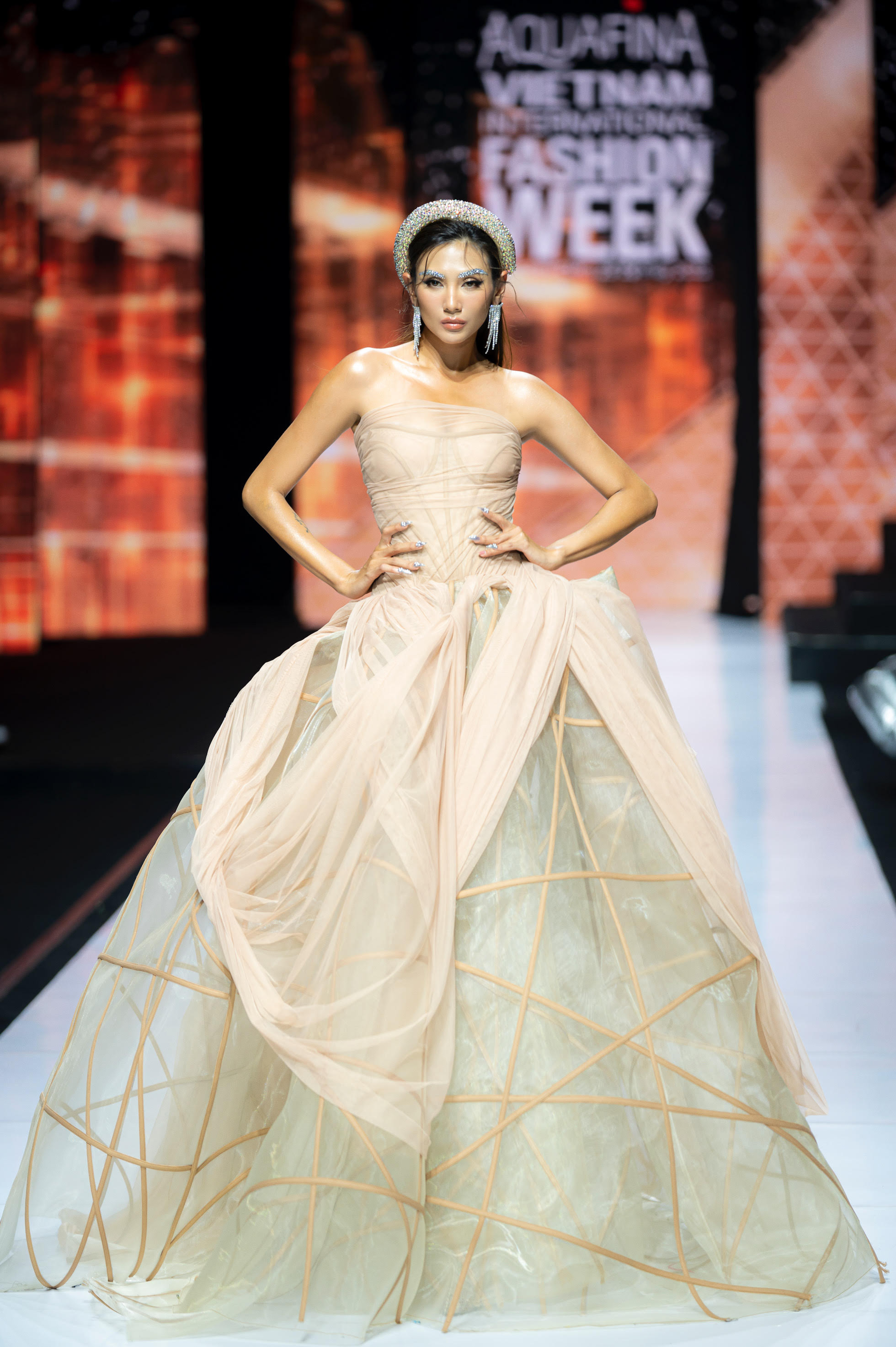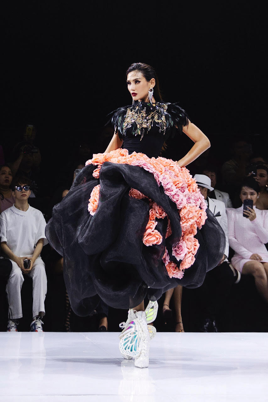 Võ Hoàng Yến mặc thiết kế thuộc bộ sưu tập "Thị Mầu in Paris" được Nguyễn Tiến Truyển giới thiệu tối 27/5. Anh mượn hình tượng nhân vật văn học để nói về cá tính mạnh mẽ của phụ nữ hiện đại.Trang phục đan xen truyền thống và hiện đại với phần tùng to, mấn đội đầu đính đá. NTK sử dụng chất liệu tái chế từ thiên nhiên như sợi sen, xơ dừa, bã cà ... để thực hiện trang phục.Một thiết đen cá tính được Hoàng Yến trình diễn trên sân khấu.Trong BST “Rose Secret” của NTK Tuyết Lê, Võ Hoàng Yến gây thương nhớ với chiếc đầm đen tượng trưng cho “bông hồng bí ẩn”, thể hiện đúng tinh thần mà nhà thiết kế muốn truyền tải. Đó chính là vẻ đẹp của người phụ nữ dịu dàng, ngọt ngào nhưng không kém phần cuốn hút bởi sự bí ẩn ma mị. Hoàng Yến cho biết, mỗi show diễn đều để lại dấu ấn đặc biệt trong hành trình chinh phục khán giả. Thế nên, cô không ngại đặt chuyến bay từ Đà Nẵng vào TP.HCM khuya 26/5 để có thời gian tốt nhất tập trung cho đêm diễn với các NTK Tuyết Lê - Nguyễn Tiến Truyển dù lịch quay tại Đà Nẵng vẫn đang đợi cô quay lại.