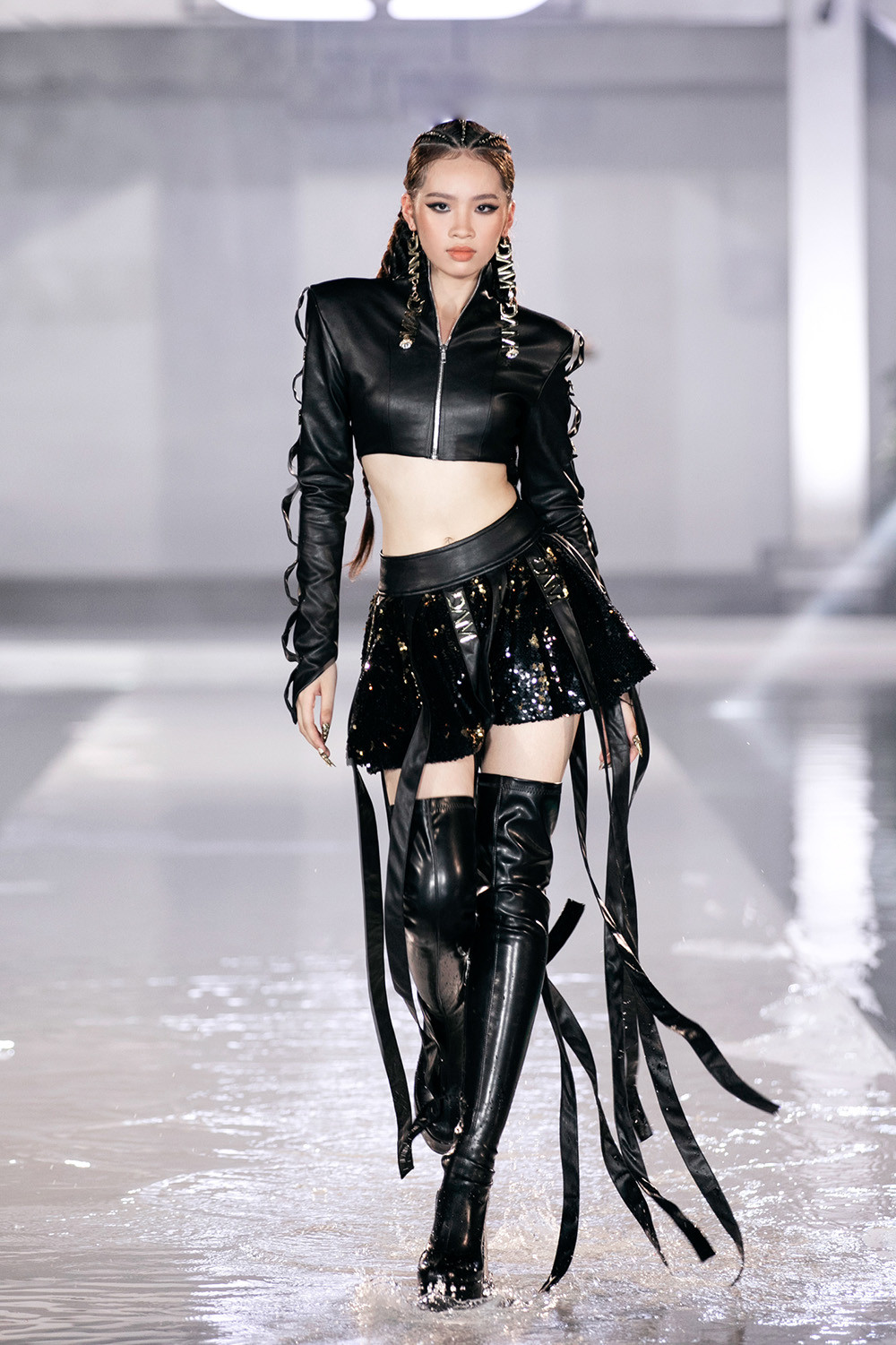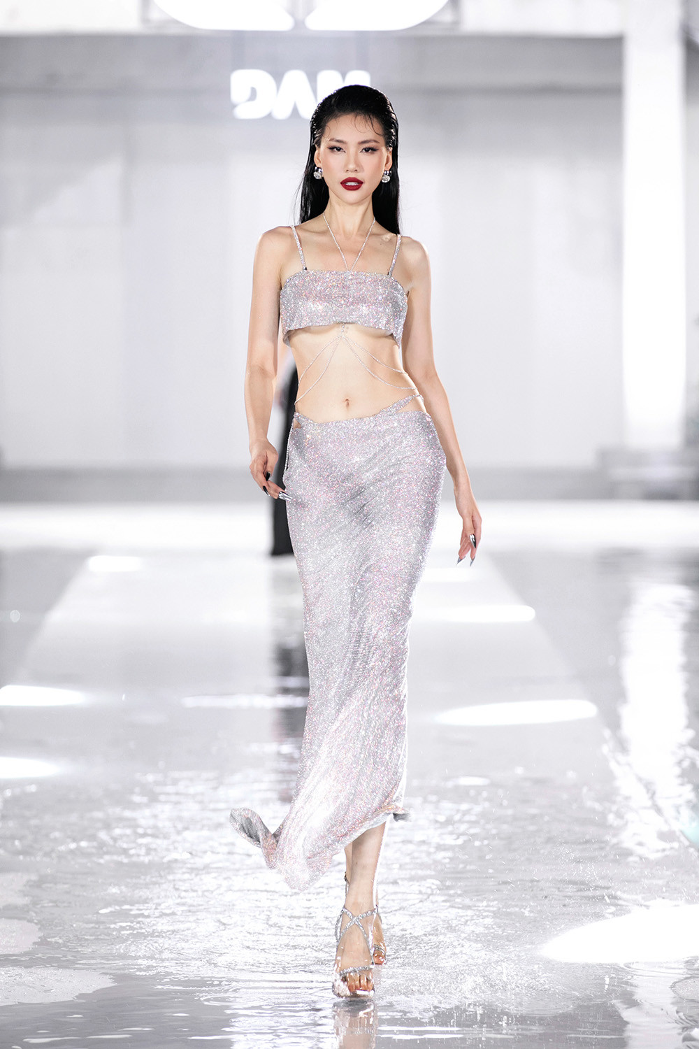 Các thành viên 'Sao nhập ngũ 2022' cũng có mặt ủng hộ Võ Hoàng Yến. Nhã Phương chọn trang phục gợi cảm dù đang ở giai đoạn cuối thai kỳ. Ngoài ra, show diễn còn có sự góp mặt của BB Trần, Lynk Lee, Hà Nhi, Minh Kha, S.T Sơn Thạch...Võ Hoàng Yến thể hiện khả năng làm DJ, đây vốn là nghề tay trái của nữ siêu mẫu. Cuối năm 2015, Hoàng Yến tuyên bố giã từ sàn catwalk, theo đuổi công việc của một DJ và từng xuất hiện ở nhiều sự kiện với vai trò này.Trên sàn diễn kết hợp bể bơi dài hơn 30m trên mặt nước, ‘học trò cưng’ Võ Hoàng Yến - mẫu nhí Almira Bảo Hà đóng vai trò first-face. Bảo Hà khoe vòng eo nhỏ với áo crop-top da tay dài phối cùng váy ngắn, điểm nhấn là phần tua rua và bốt da cao cổ. Sau gần nửa năm sinh con đầu lòng, á hậu Mâu Thủy ‘hở bạo’ với thiết kế xuyên thấu khoe trọn vòng 1 và đôi chân dài.Chị em Lệ Nam, Nam Em diện trang phục tương đồng tông bạc ánh kim, tự tin catwalk trên sàn diễn ngập nước khi xích tay lại với nhau.Huấn luyện viên tại Miss Earth Vietnam 2023 - siêu mẫu Bùi Quỳnh Hoa khoe vòng 1 lấp ló với áo crop-top ‘siêu ngắn’, kết hợp phần đầm ôm sát. Á hậu Lệ Hằng diện trang phục xẻ cao đến tận eo được điểm xuyết bằng những sợi xích vàng, táo bạo để lộ một phần vòng 3.Siêu mẫu Minh Tú thần thái với đầm cut-out, phối cùng áo trong màu vàng ánh kim để tạo điểm nhấn. Miss Earth Vietnam 2022 Thạch Thu Thảo catwalk trong trang phục màu bạc ánh kim, khoét sâu khoe khéo vòng 1.Võ Hoàng Yến cũng trình diễn với bodysuit tông đen, phối cùng bao tay da và phần quần liền giày có chất liệu trong suốt độc đáo.Vedette - Hoa hậu Hoàn vũ Việt Nam 2022 Ngọc Châu để tóc vàng lạ mắt, xuất hiện cùng đôi cánh khổng lồ hình trái tim, khoe trọn cặp chân dài 1,12m, khép lại show diễn của Võ Hoàng Yến.Tham gia trình diễn còn có Bùi Lý Thiên Hương, Tuyết Như, Hà Kino, Bé Quyên, thí sinh Miss Universe Vietnam 2023 Duyên Bkrông... Trên dưới 50 người mẫu trình diễn các thiết kế cắt xẻ có màu sắc chủ đạo đen và bạc. Võ Hoàng Yến mong muốn tôn vinh vẻ đẹp nguyên bản của phụ nữ dù sở hữu bất kỳ hình dáng cơ thể nào.Cuối đêm diễn, Võ Hoàng Yến xúc động bật khóc nức nở, cảm ơn khán giả, bạn bè cũng như ê-kíp đã ủng hộ và đồng hành cùng cô.