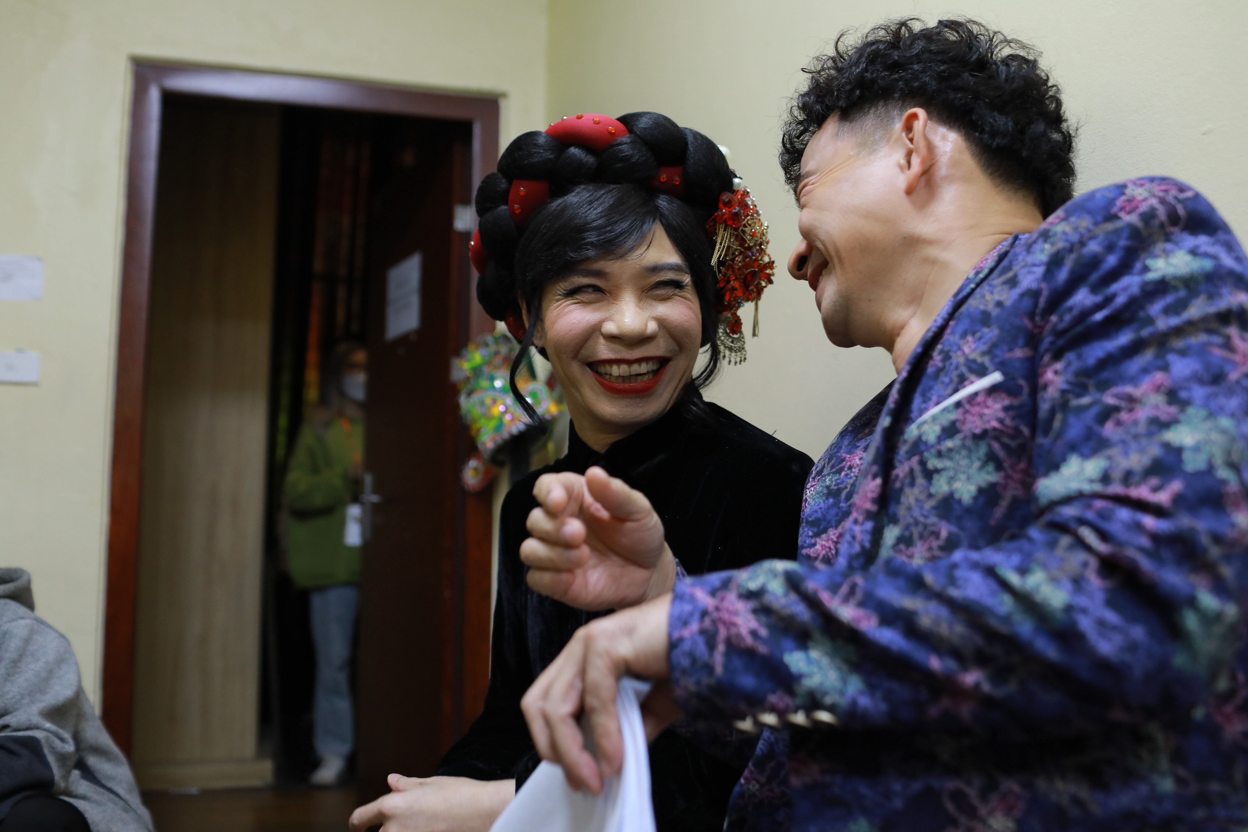 Chị Ngọc Hà chăm chút cho chồng - NSND Công Lý ở hậu trường ghi hình Táo quân 2023. Ảnh: Nhân vật cung cấp.
