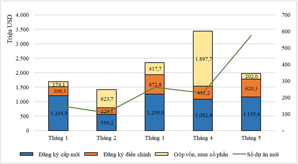 Theo Cục Đầu tư nước ngoài, tình hình thu hút đầu tư nước ngoài vào Việt Nam đã có sự cải thiện. Số dự án đầu tư mới tiếp tục tăng nhẹ 1,2 điểm phần trăm so với 4 tháng và tăng mạnh so với cùng kỳ (tăng 66,4%).