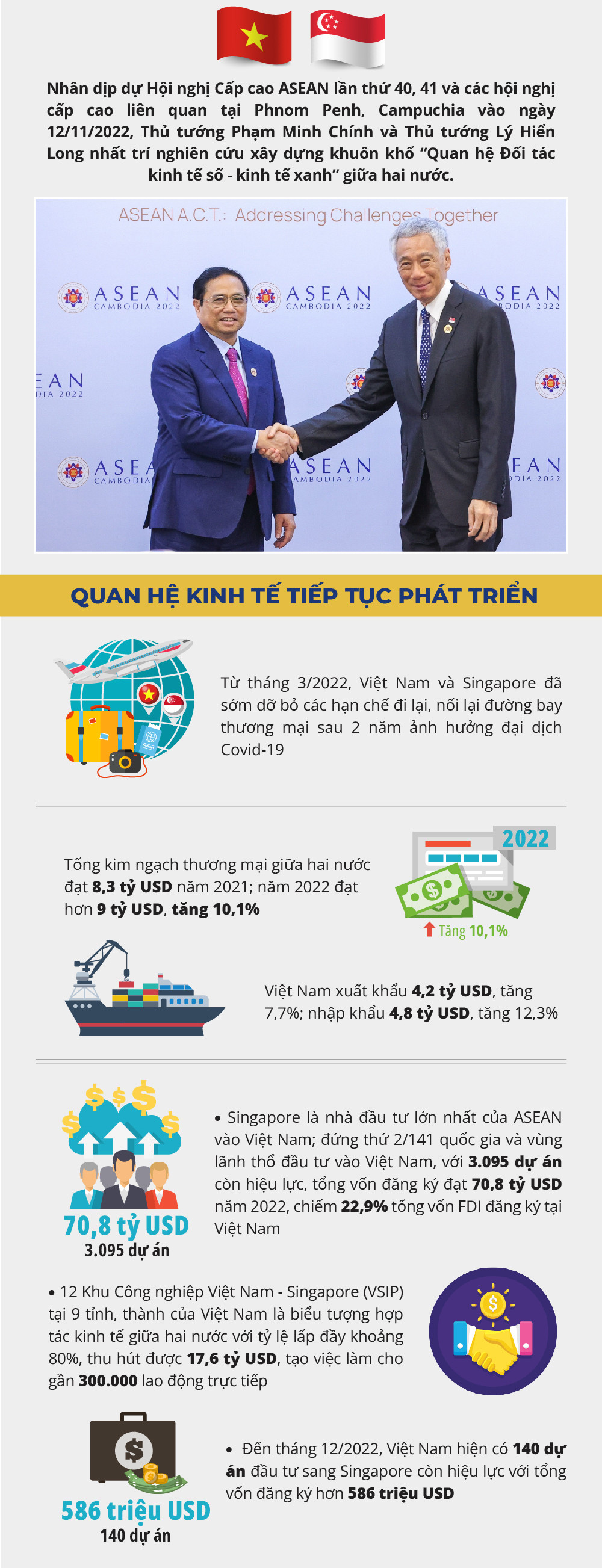 Thủ tướng Phạm Minh Chính khẳng định, Việt Nam khuyến khích doanh nghiệp Singapore mở rộng phát triển các khu VSIP theo hướng khu công nghiệp xanh, thông minh, tiết kiệm năng lượng; đồng thời nghiên cứu, mở thêm VSIP tại các địa phương xa trung tâm, nhằm hỗ trợ Việt Nam phát triển đồng đều các vùng miền.