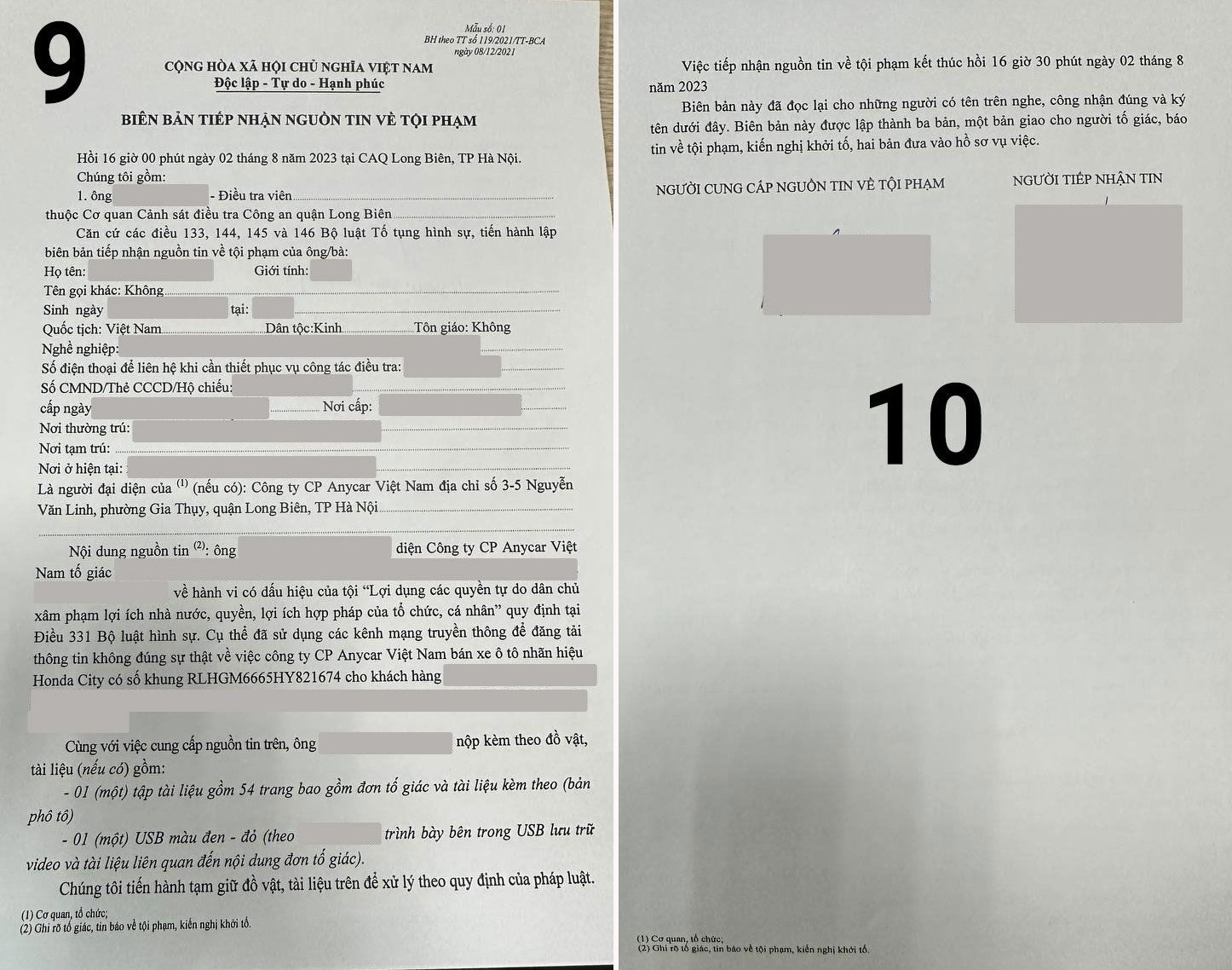 Theo AnyCar, đơn trình báo và tố cáo được công ty gửi 5 cơ quan gồm Công an quận Long Biên, Viện Kiểm sát nhân dân quận Long Biên, Tòa án quận Long Biên, Phòng An ninh mạng và phòng chống tội phạm công nghệ cao, Công an TP. Hà Nội và Thanh tra Bộ Thông tin và Truyền thông (TT&TT).