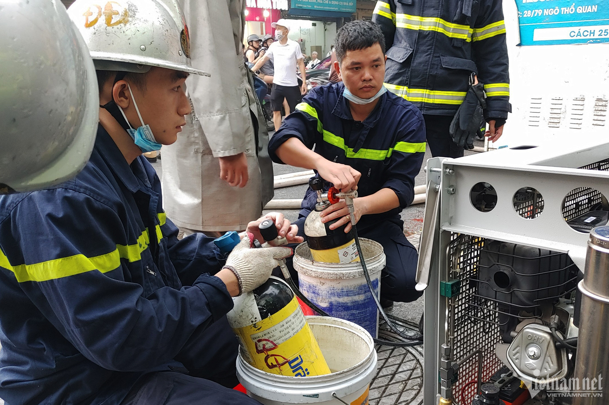 Lực lượng Cảnh sát PCCC&CNCH điều động 3 trạm nạp khí lưu động cùng hàng chục bình oxy để lính cứu hỏa có đủ dưỡng khí vào bên trong ngôi nhà.