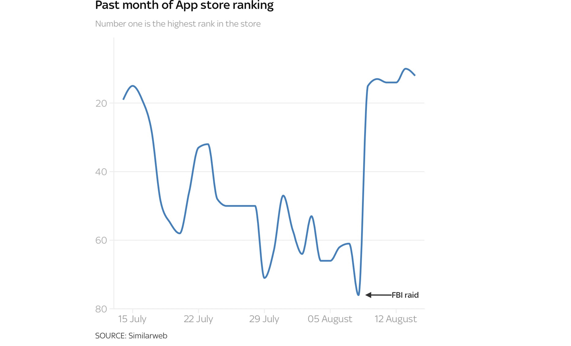Theo Sky News, ứng dụng này đã tăng 61 bậc trong cửa hàng ứng dụng của Apple, từ vị trí 76 lên 15 vào ngày 9/8, một ngày sau khi nhà riêng của ông Trump bị lục soát. FBI muốn tìm các hộp đựng tài liệu mật được cất giữ tại Mar-a-Lago sau khi ông Trump kết thúc nhiệm kỳ.