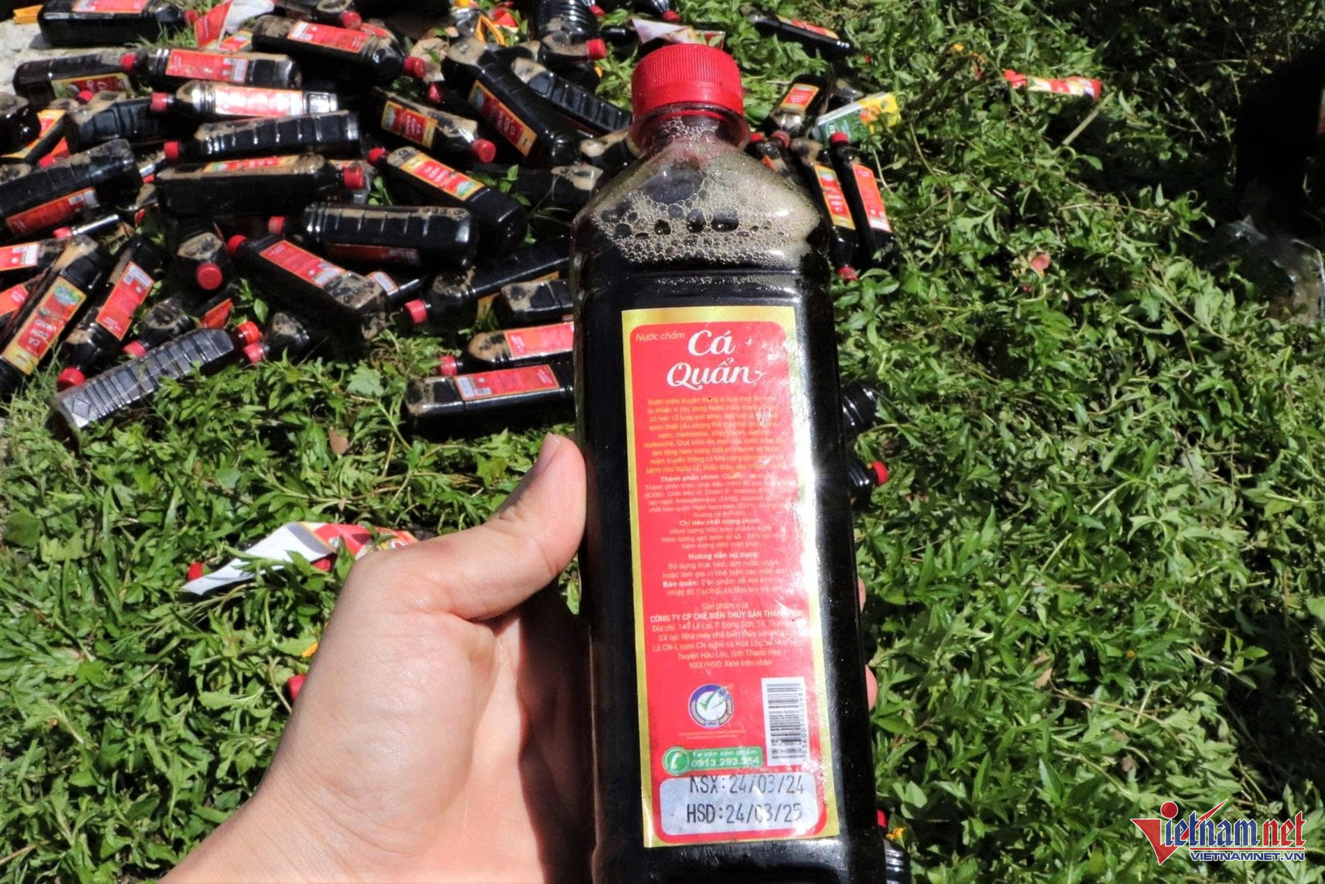 Các chai nước mắm có thể tích từ 0,5 đến 5 lít, mang nhãn “Chắt cá cơm” và “Cá cơm vàng” do một công ty thủy sản có trụ sở tại tỉnh Thanh Hóa sản xuất. Một số sản phẩm còn nguyên bao bì đóng gói, nằm chất đống hoặc rải rác trong bụi cây. Đây là khu vực vắng người qua lại, xung quanh chủ yếu là đất trống.